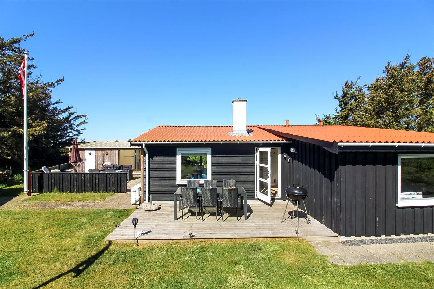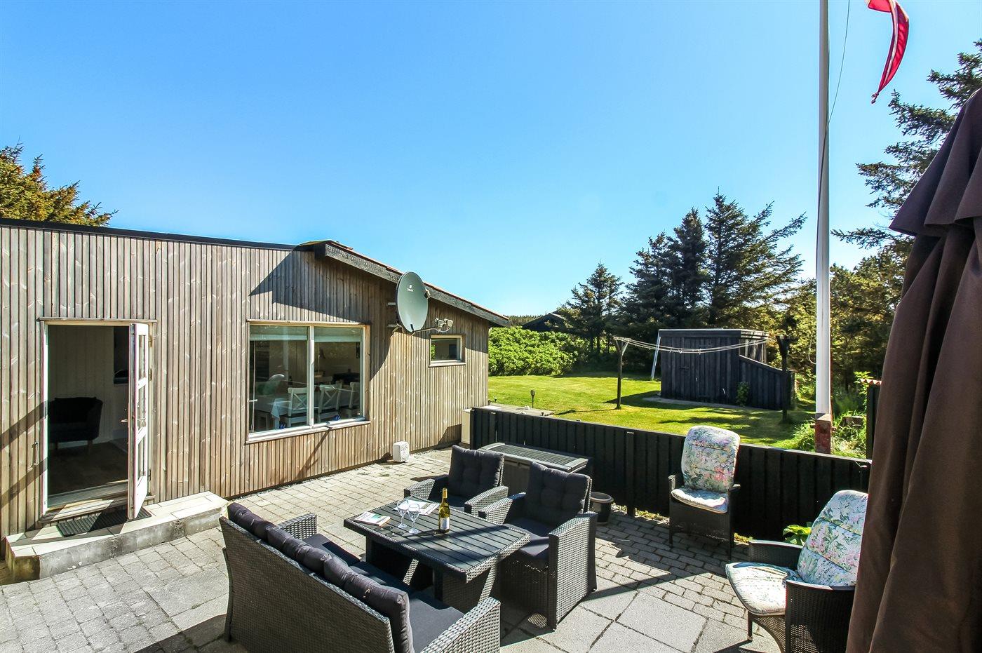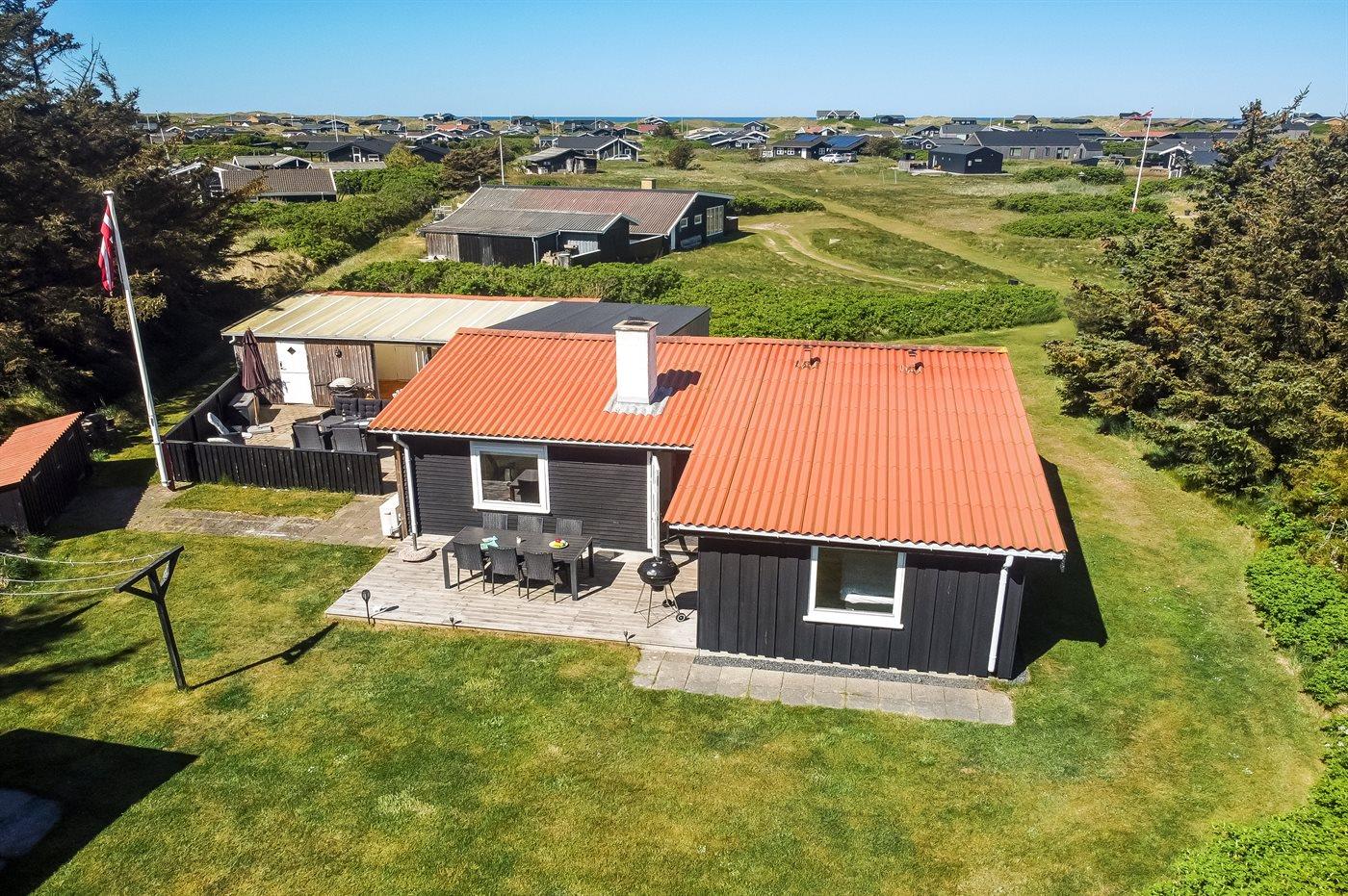 Ferieboligen er beliggende på en 1475 m² stor naturgrund. Der er 600 m til havet. Nærmeste forretning er beliggende i en afstand af 1250 m. Til ferieboligen hører 15 m² lukket terrasse. Ligeledes er der adgang til udestue. Gynge. Rutchebane. Der er installeret stik til opladning af elbil. Parkering ved ferieboligen.