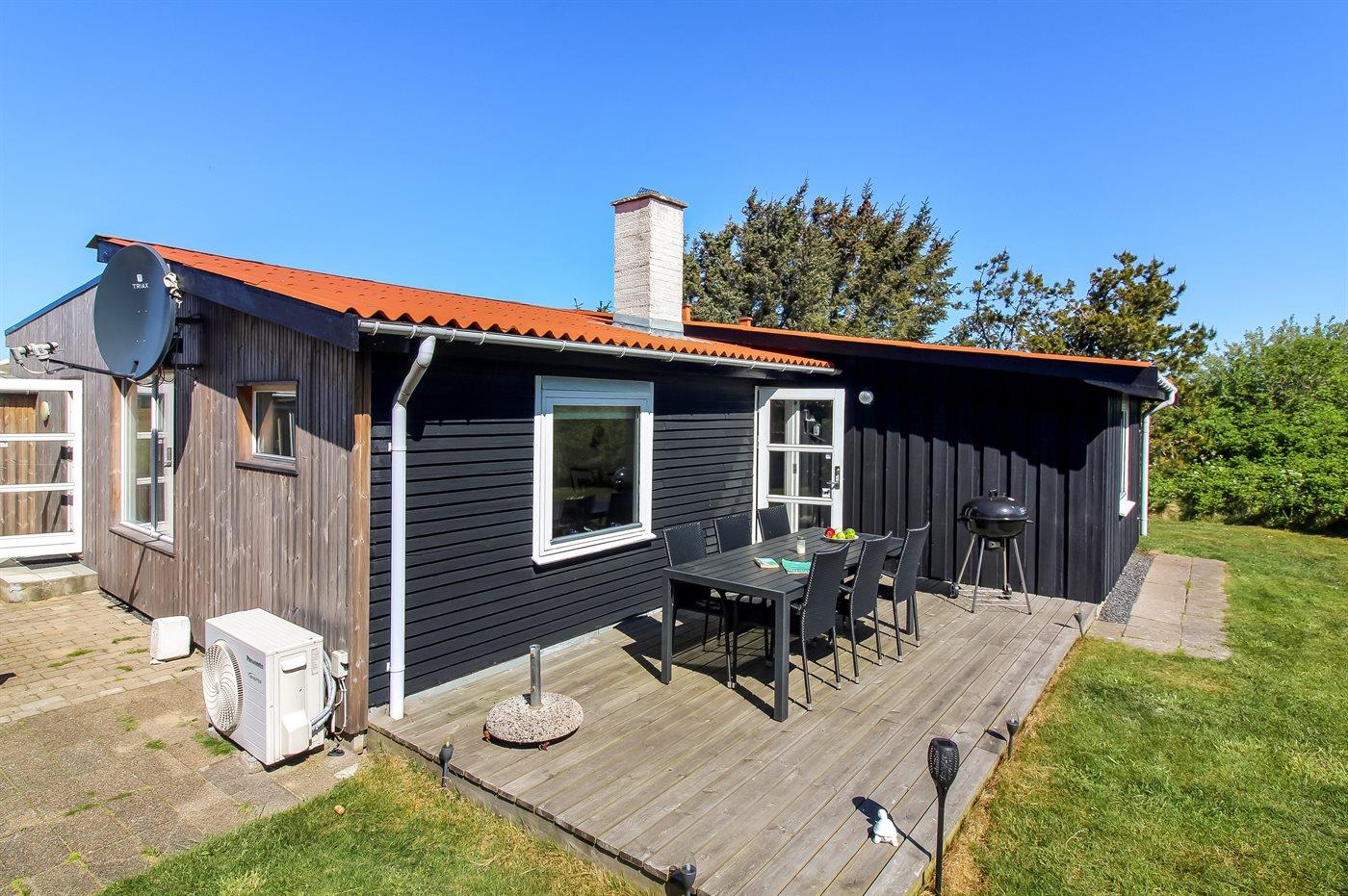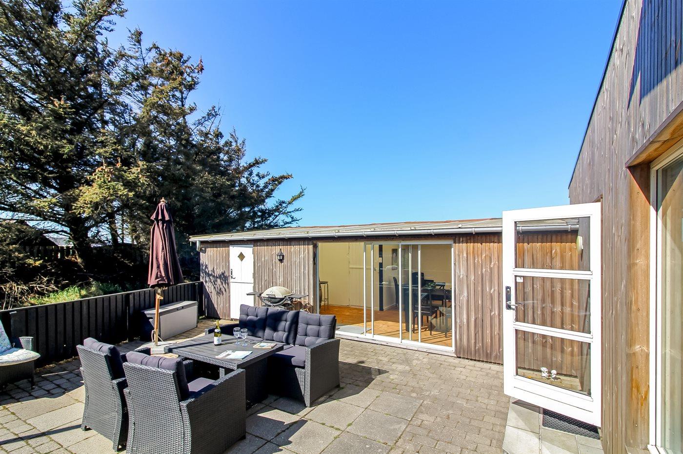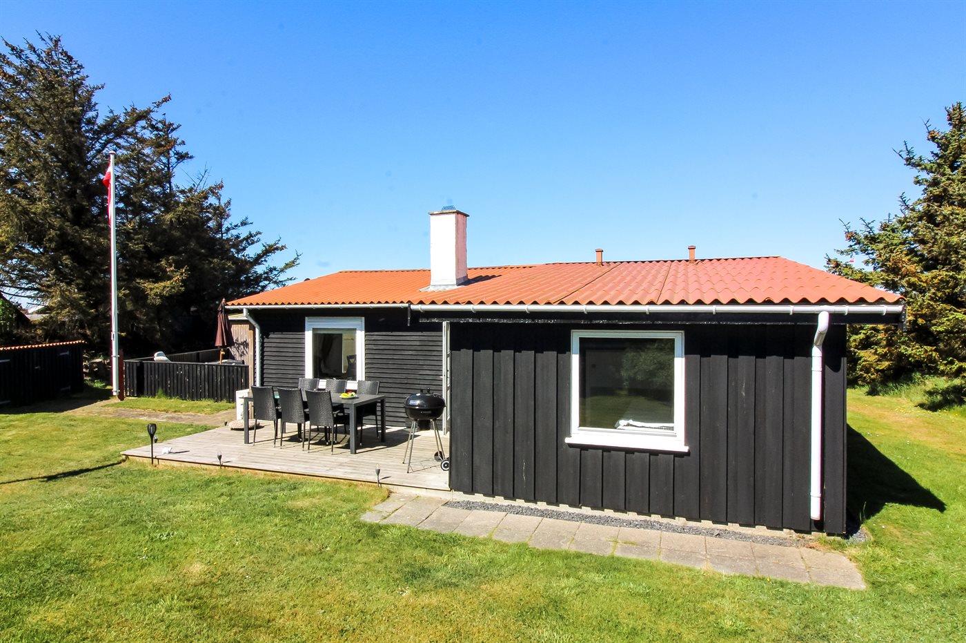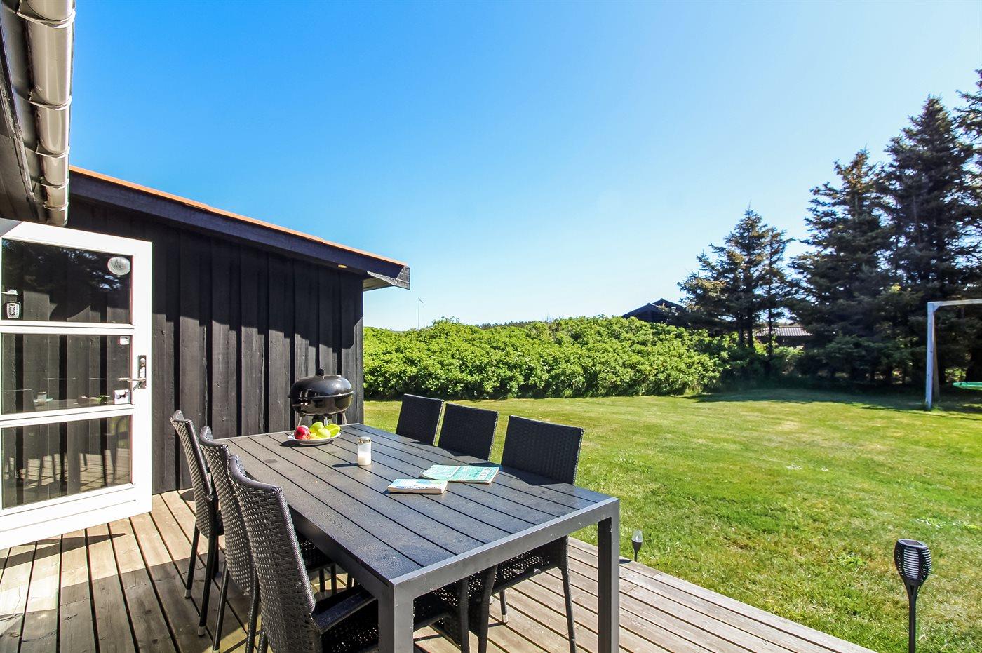 Ferieboligen er beliggende på en 1475 m² stor naturgrund. Der er 600 m til havet. Nærmeste forretning er beliggende i en afstand af 1250 m. Til ferieboligen hører 15 m² lukket terrasse. Ligeledes er der adgang til udestue. Gynge. Rutchebane. Der er installeret stik til opladning af elbil. Parkering ved ferieboligen.
