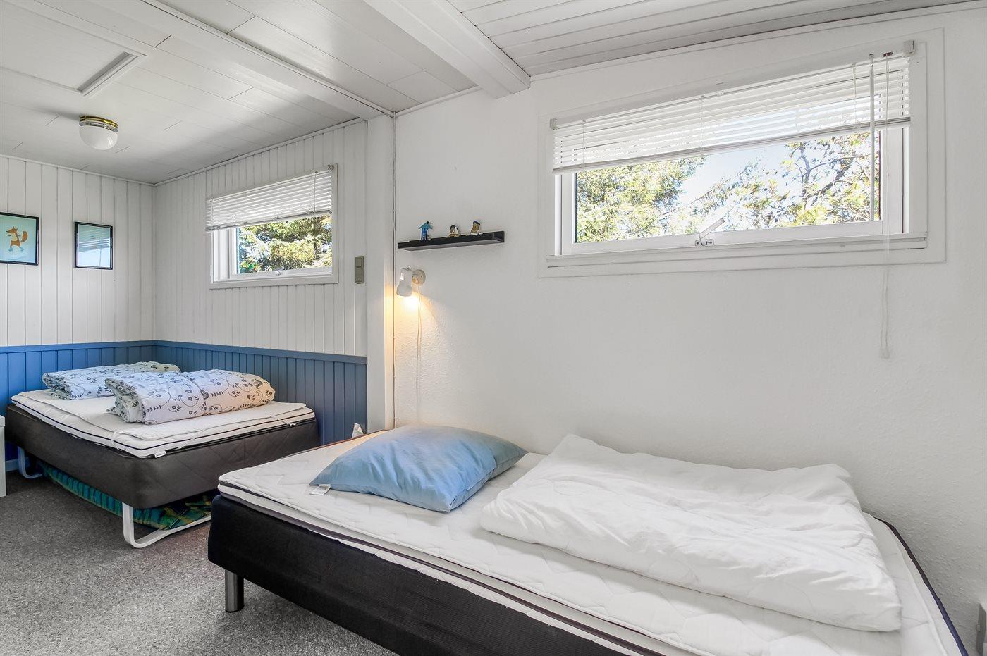 Der er i alt 3 soveværelser. Sovepladserne fordeler sig på: 4 sovepladser i dobbeltsenge. 1 soveplads i enkeltseng. 1 soveplads i sovesofa (enkelt).- 2 af disse sovepladser befinder sig i et anneks. Derudover er der 1 stk. barneseng.