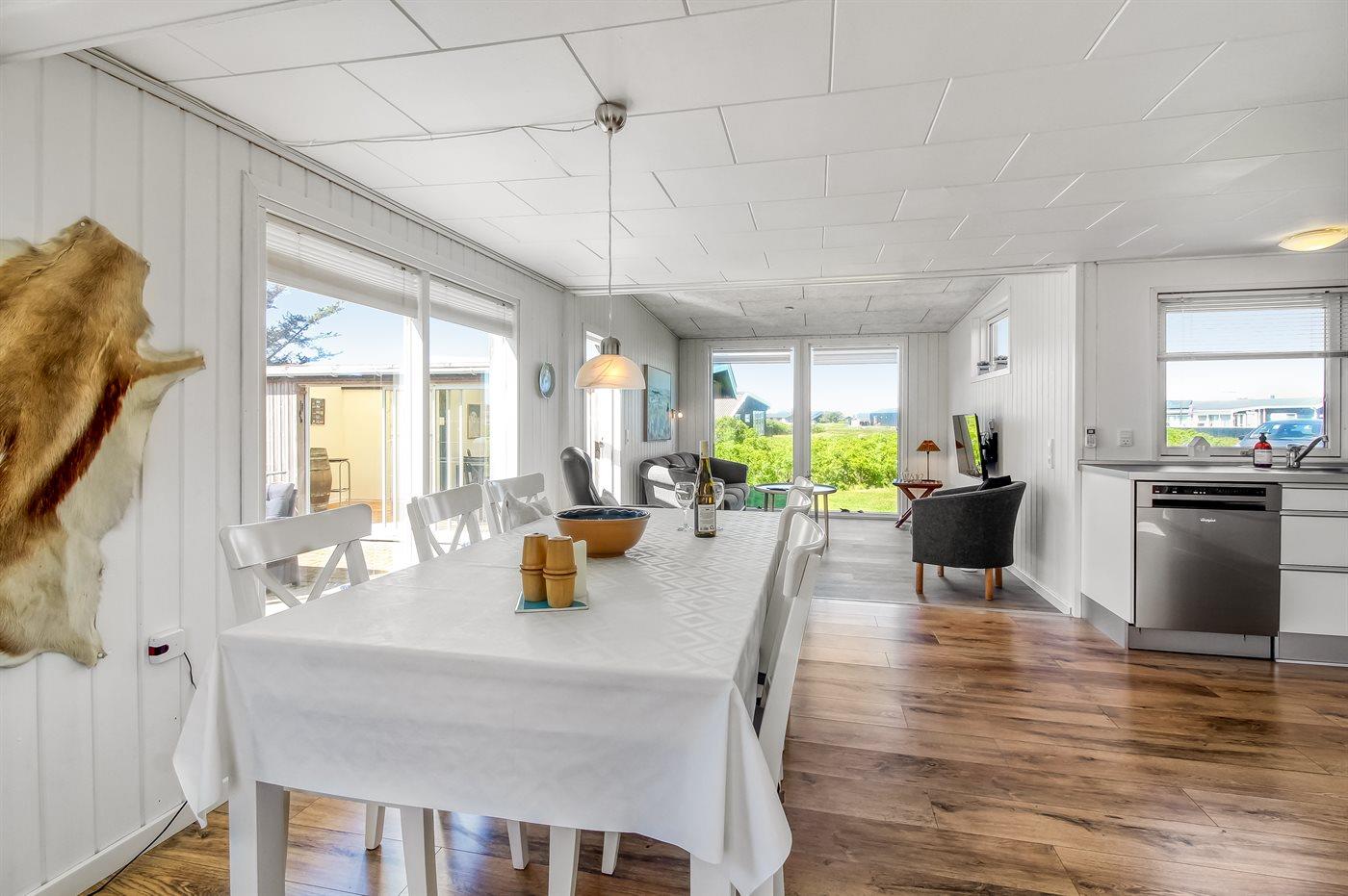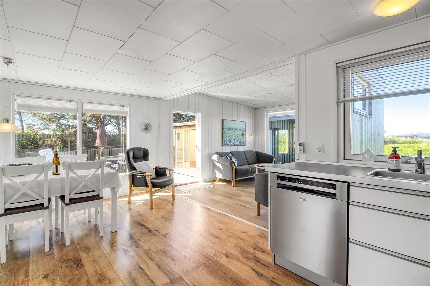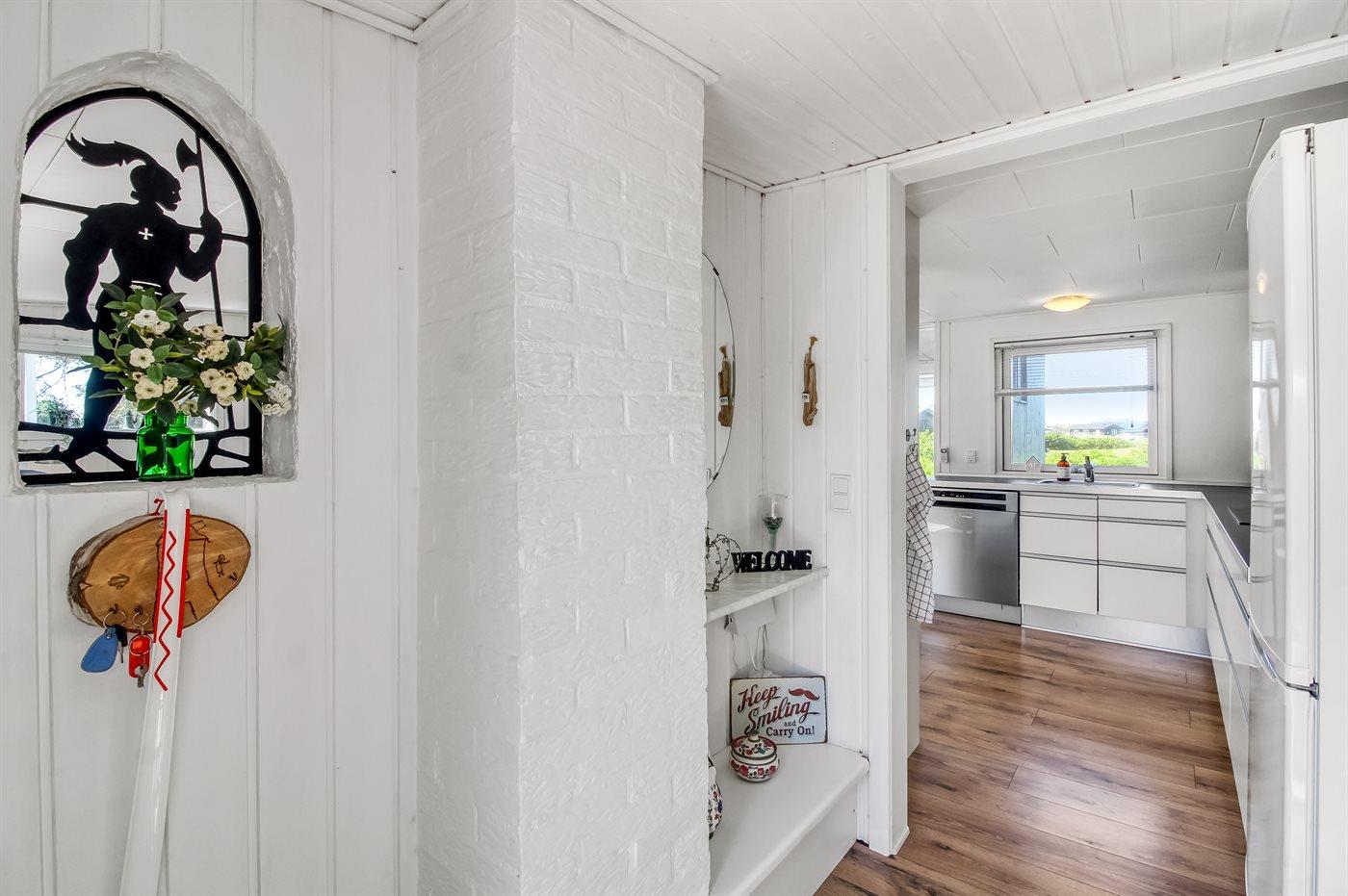 Køkkenet er udstyret med 1 køleskab. Der er 4 keramiske kogeplader, varmluftovn samt opvaskemaskine.