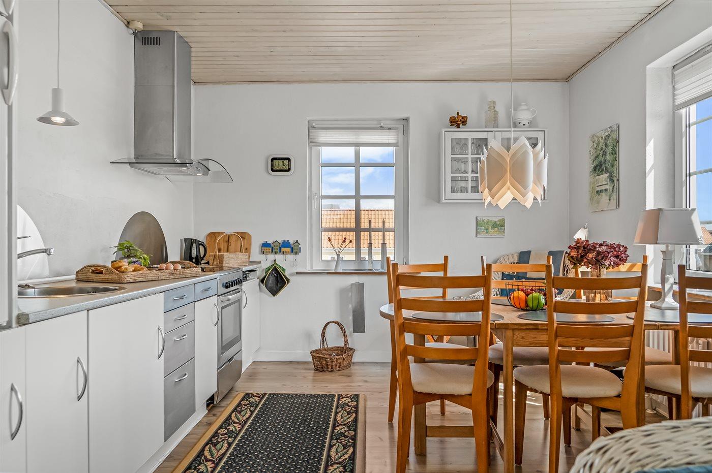 Køkkenet er udstyret med 1 køleskab. Der er 4 keramiske kogeplader, varmluftovn.