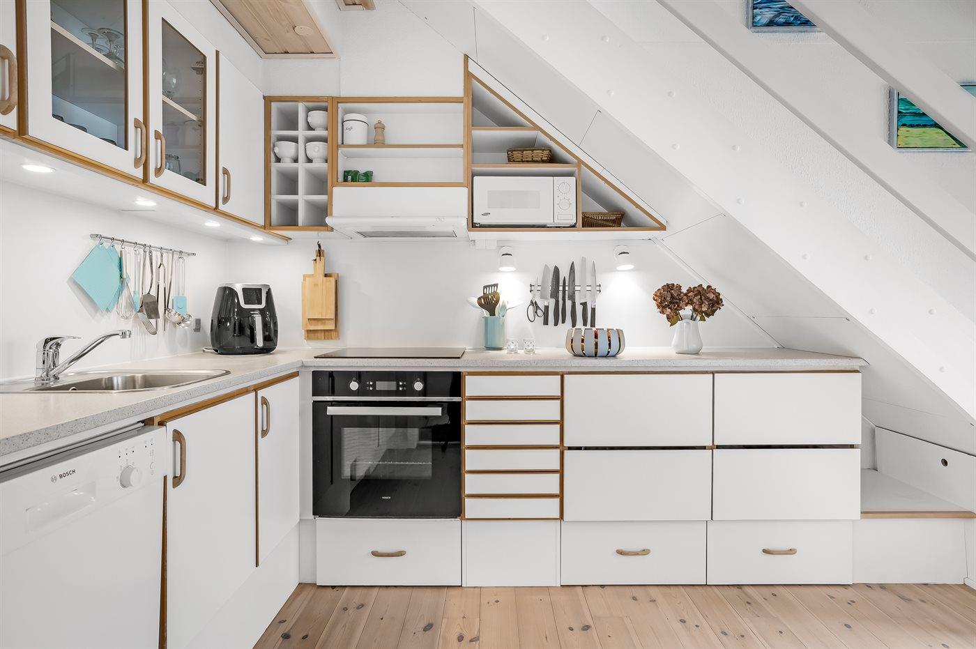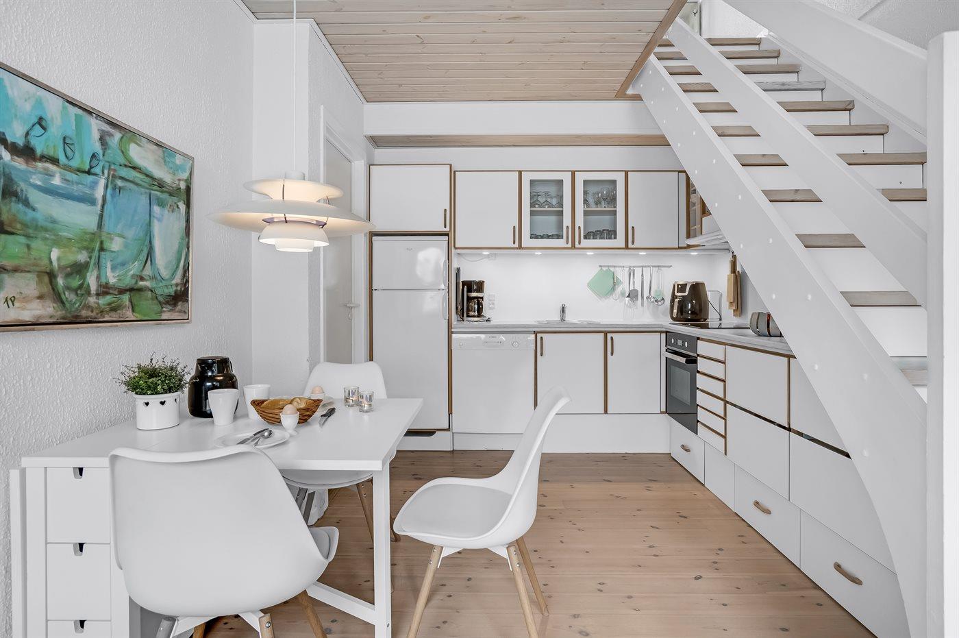 Køkkenet er udstyret med 1 køleskab. Der er 4 induktionskogeplader, varmluftovn, mikrobølgeovn samt opvaskemaskine.