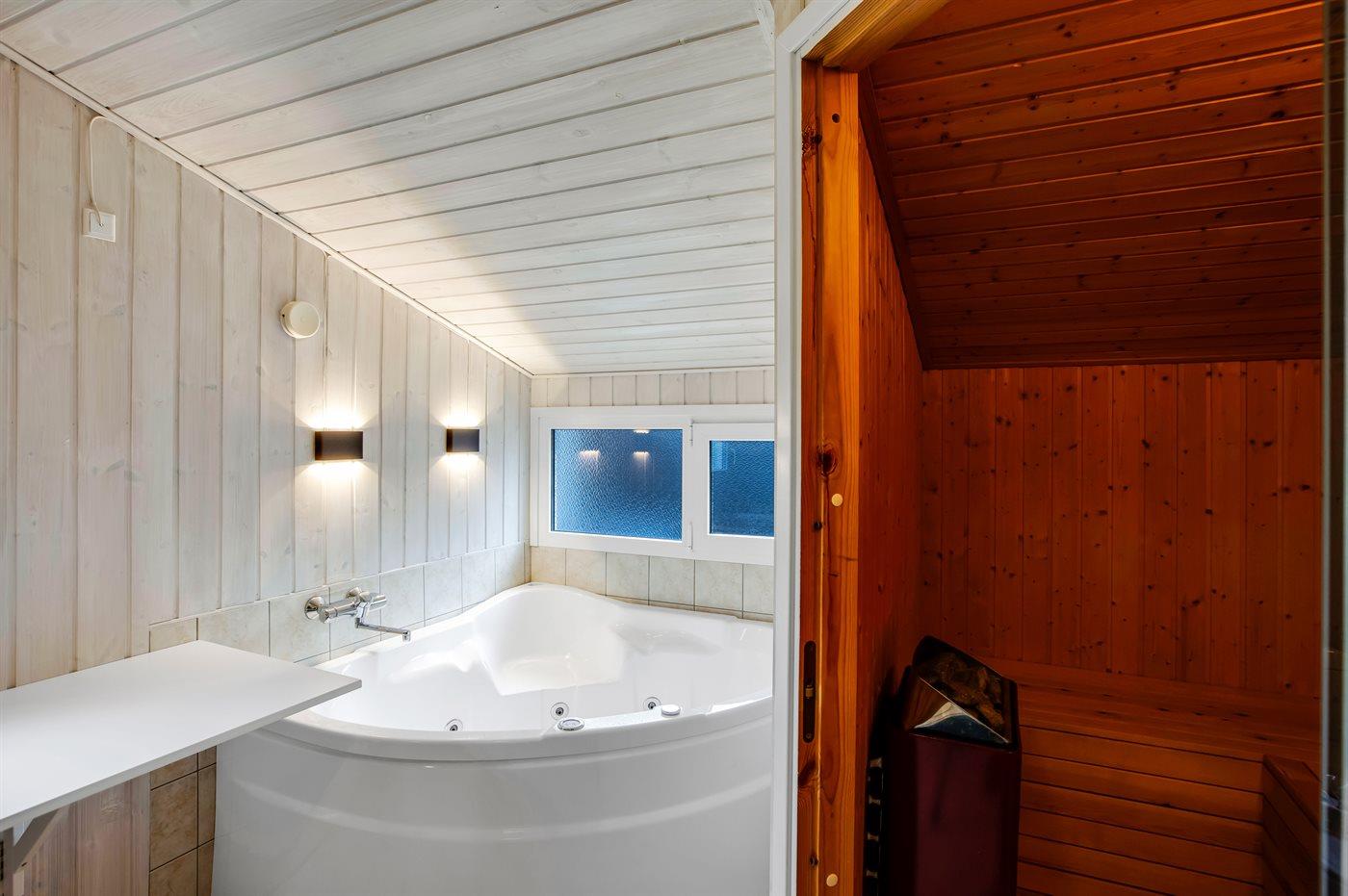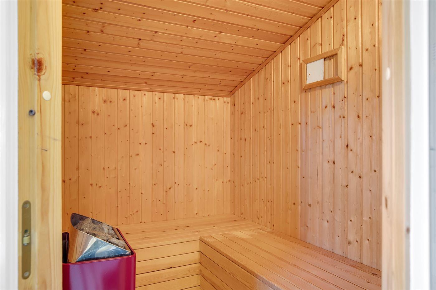Der er 1 badeværelse med bruseniche og 2 toiletter, heraf 1 gæstetoilet. Der er gulvvarme på 1 badeværelse. Der er gulvvarme på gæstetoilettet. I saunaen er der mulighed for afslapning.