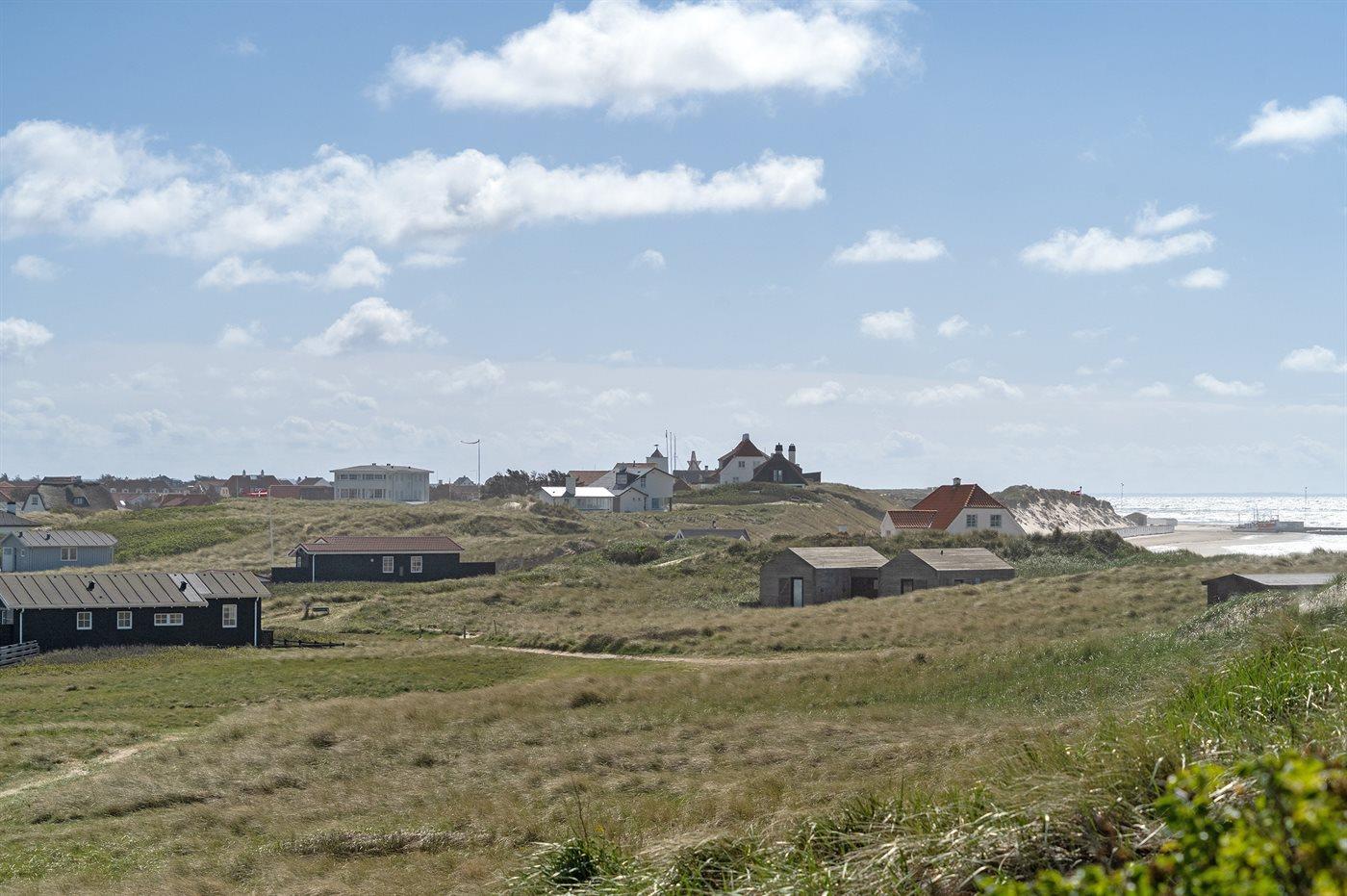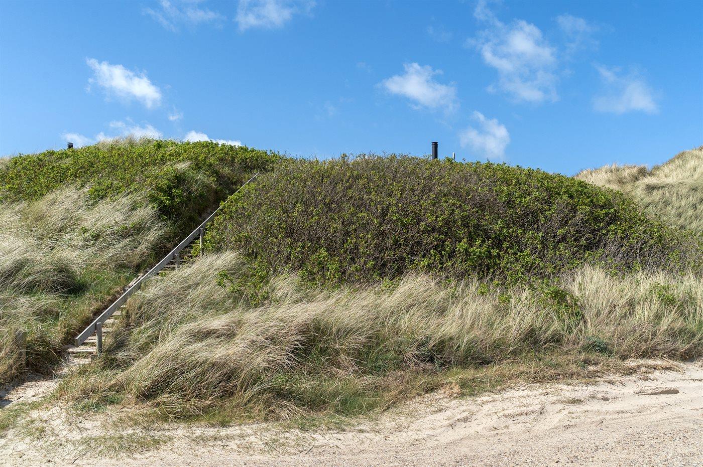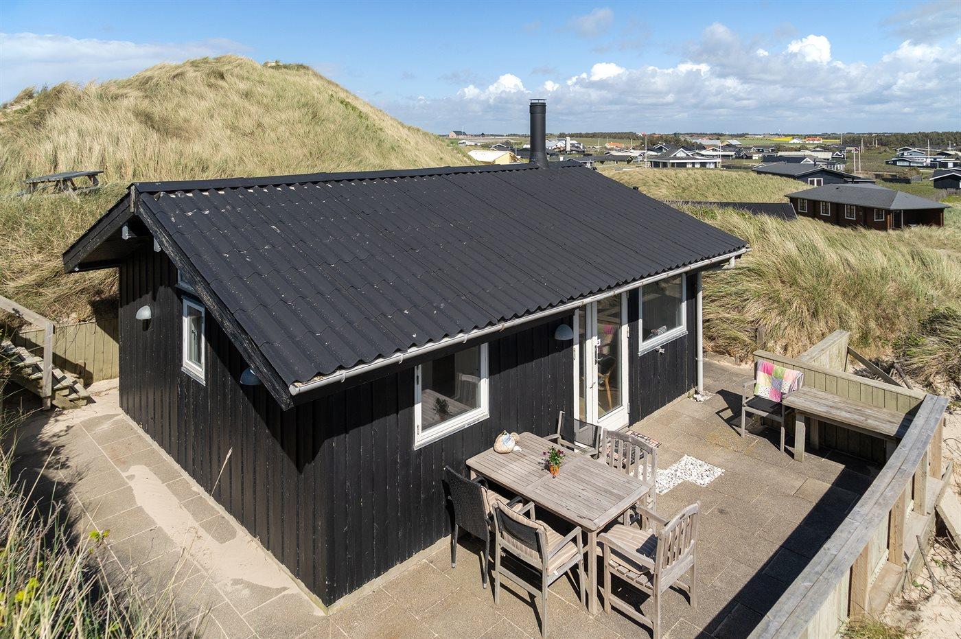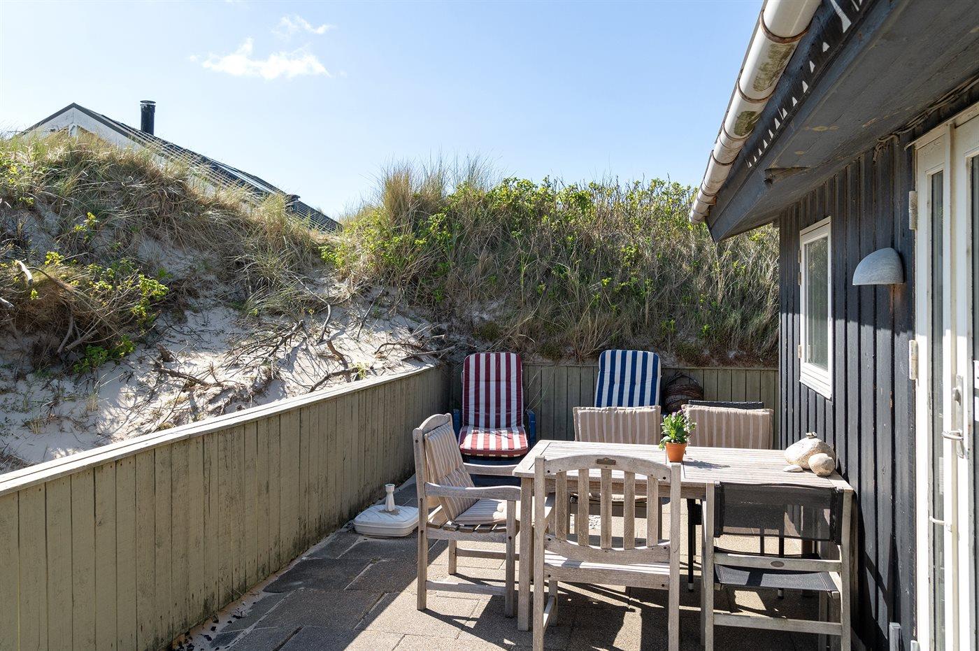 Huset ligger i en gryde i klitten, det betyder at man her er omgivet af naturen med sand, hav og marehalm, men der findes altid en krog eller et hjørne, der selv på de mest blæsende dage, giver læ. Det kan være på den 20 m2 store terrasse, eller i klitten på den 1006 m2 store naturgrund, hvor der opsat bord- og bænkesæt eller stole, som kan tages med ud i klitten.
