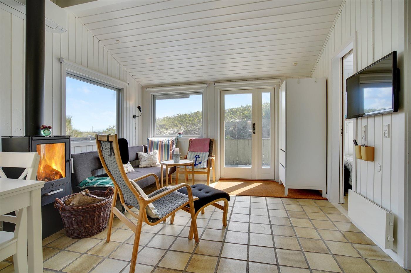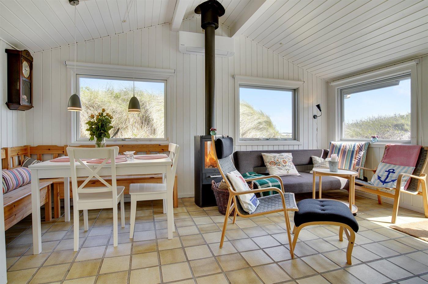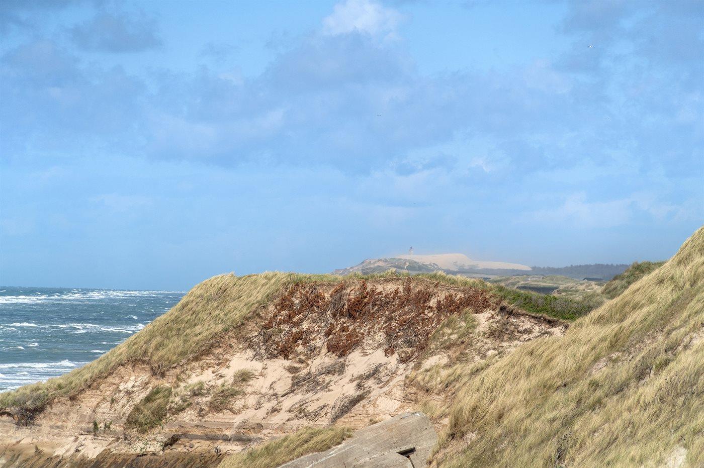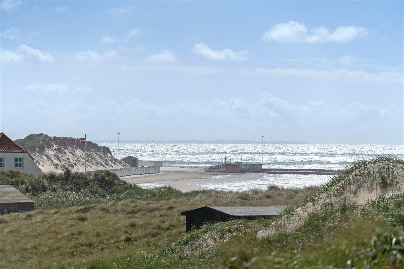 Huset ligger i en gryde i klitten, det betyder at man her er omgivet af naturen med sand, hav og marehalm, men der findes altid en krog eller et hjørne, der selv på de mest blæsende dage, giver læ. Det kan være på den 20 m2 store terrasse, eller i klitten på den 1006 m2 store naturgrund, hvor der opsat bord- og bænkesæt eller stole, som kan tages med ud i klitten.