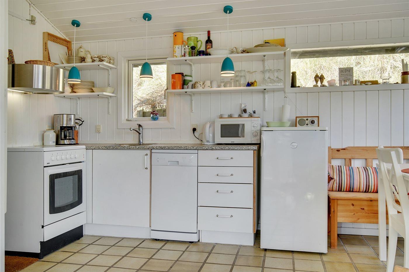 Køkkenet er udstyret med 1 køle- og fryseskab, 4 keramiske kogeplader, varmluftovn og opvaskemaskine.