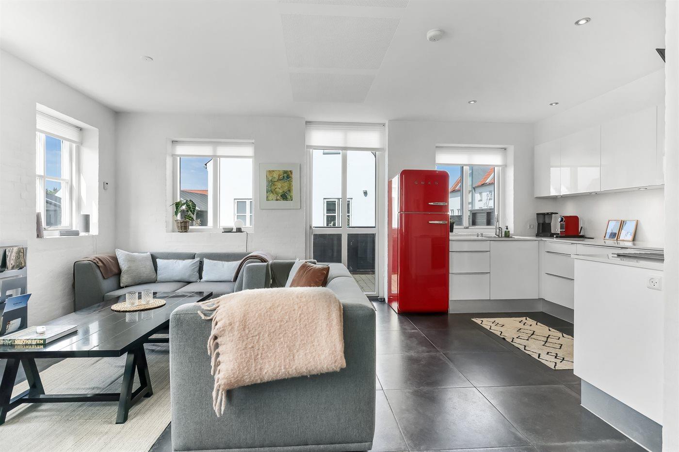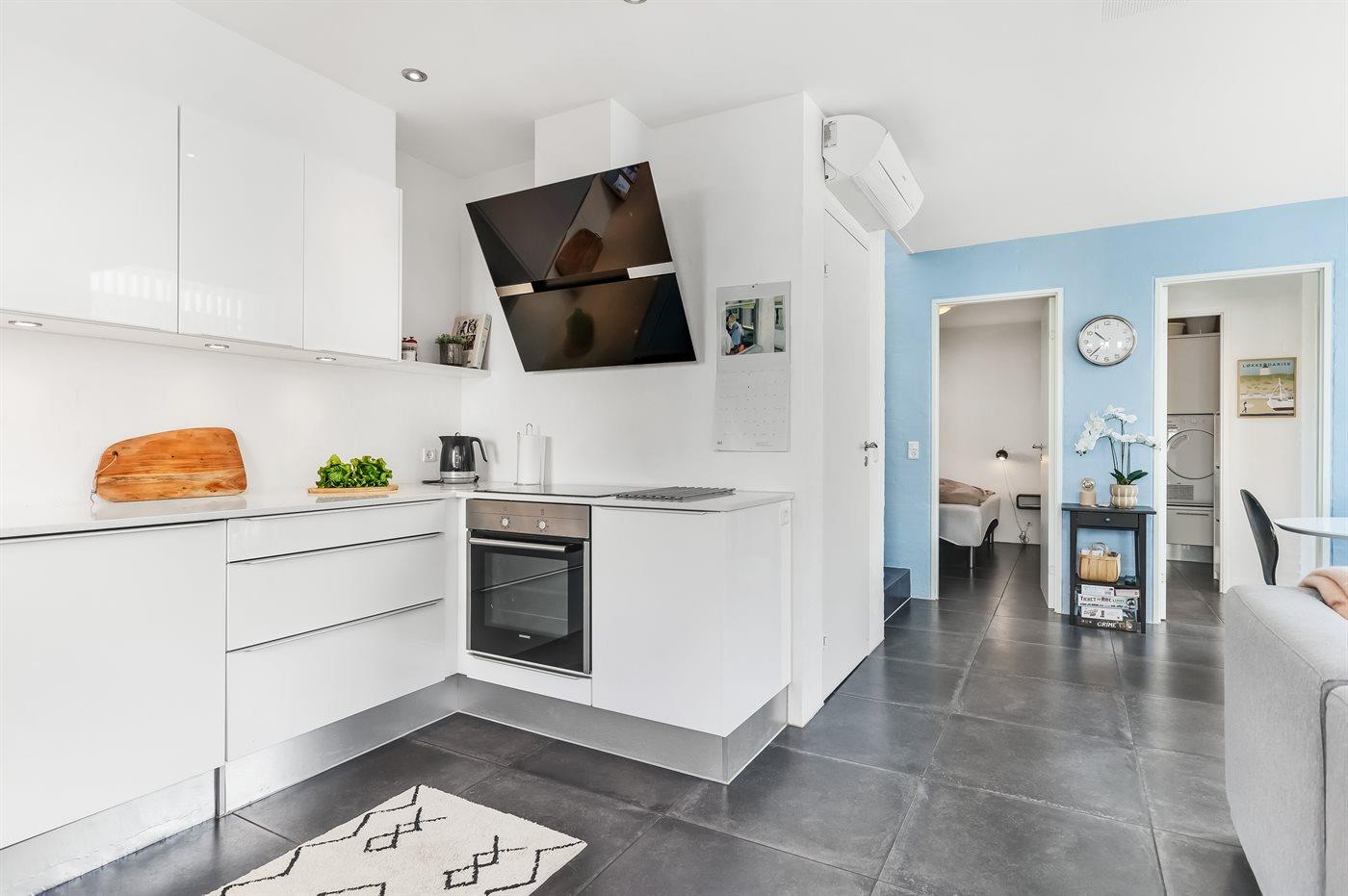 Køkkenet er udstyret med 1 køleskab. Der er 4 keramiske kogeplader, varmluftovn samt opvaskemaskine.