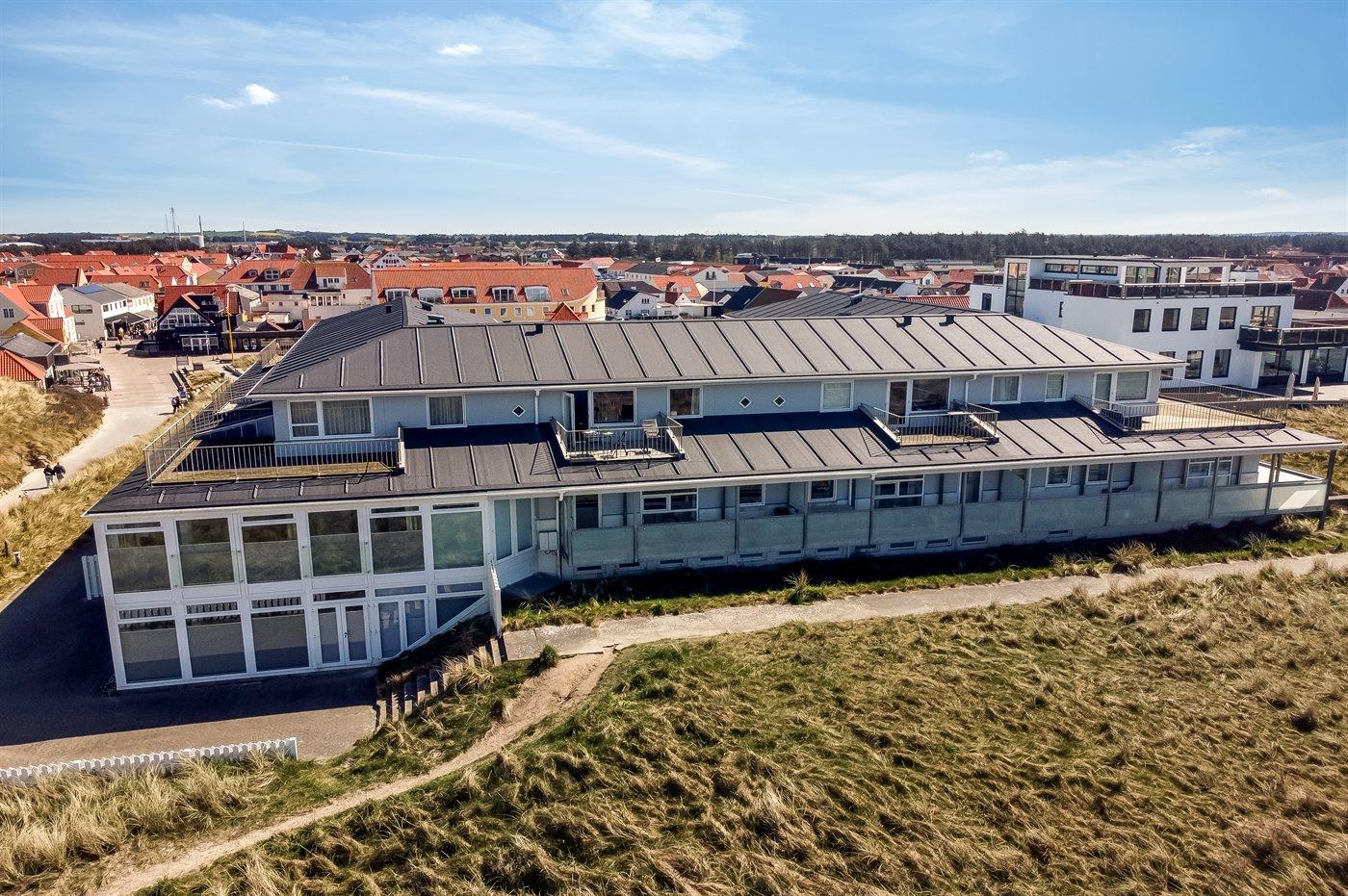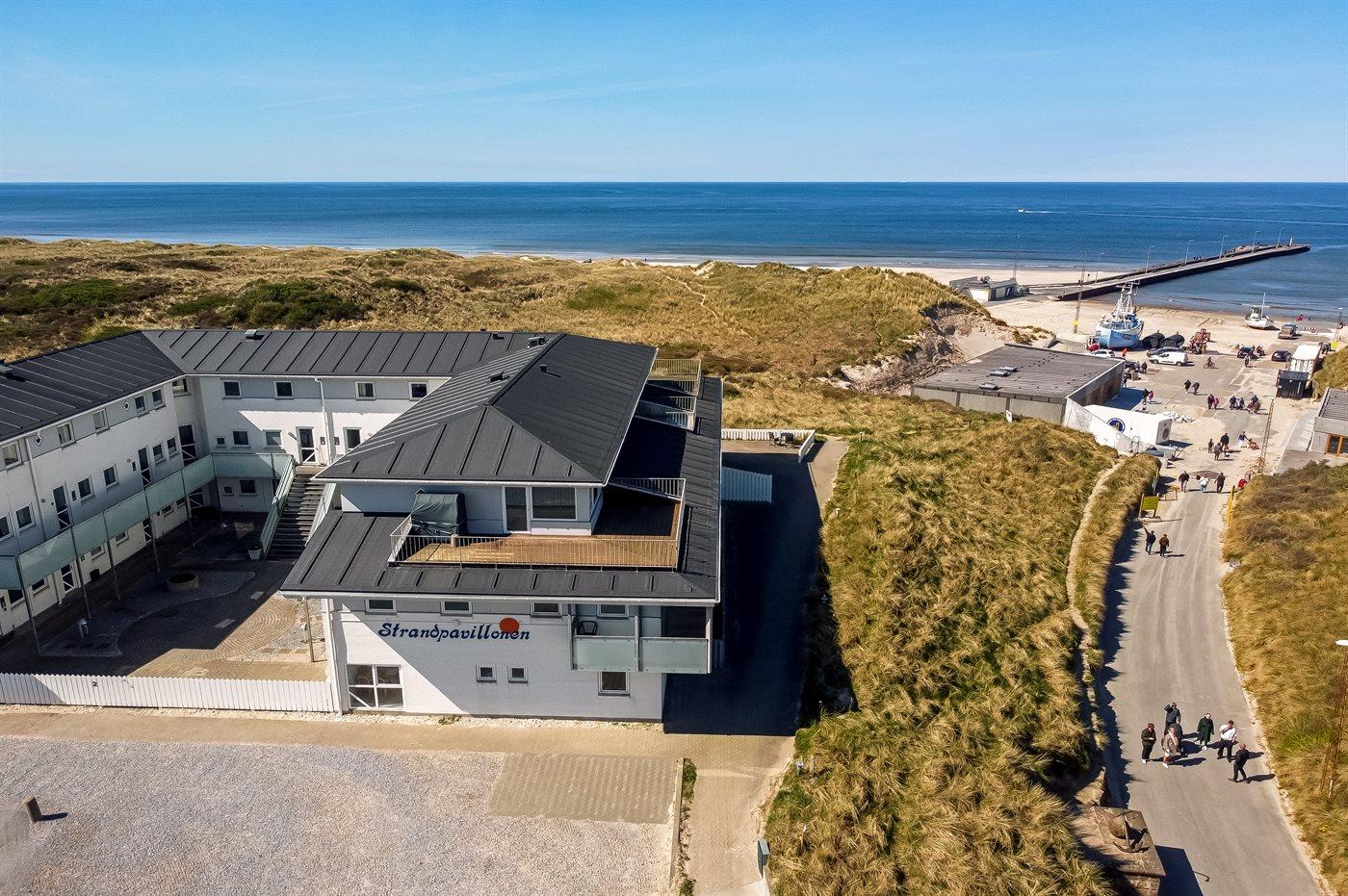 Ferielejlighed på 1. sal i Strandpavillonen Løkken. Fra opholdsstue og altan er der panoramaudsigt over havet og klitterne. Strandpavillonen er opført i 1987.