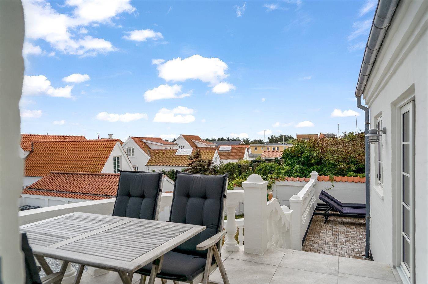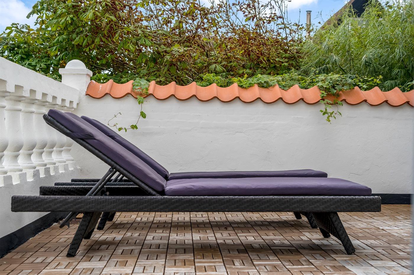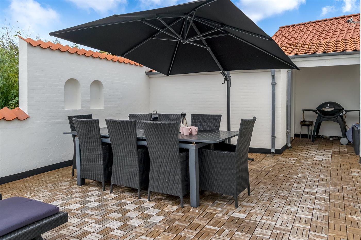 På terrassen kan man nyde en afslappet stund i et læfyldt hjørne med muligheder for at hygge og lave mad på grillen.