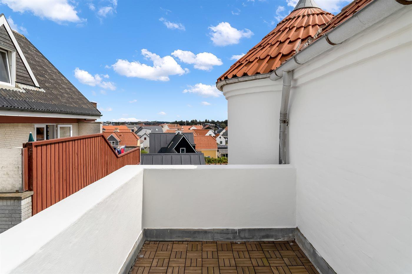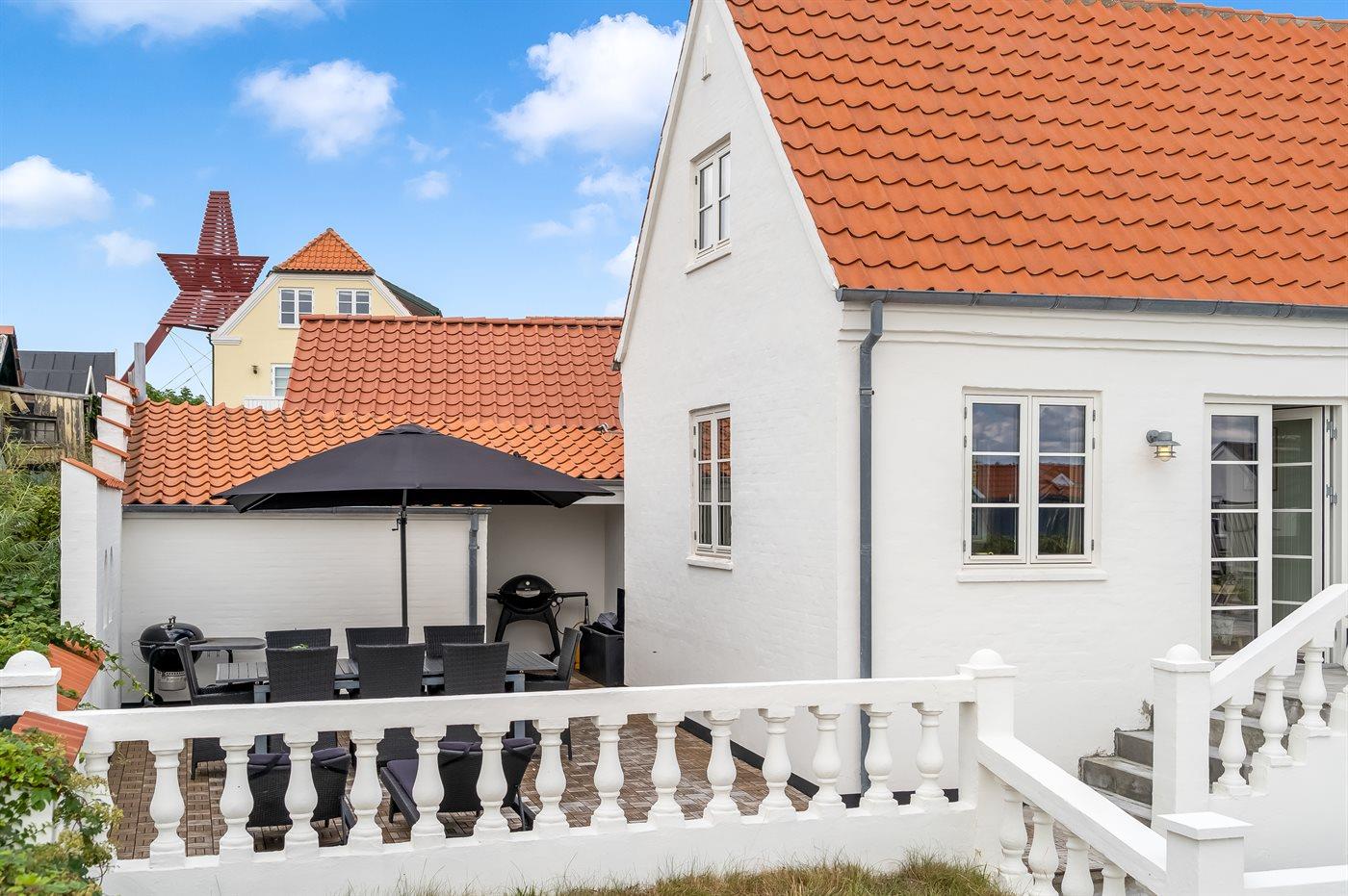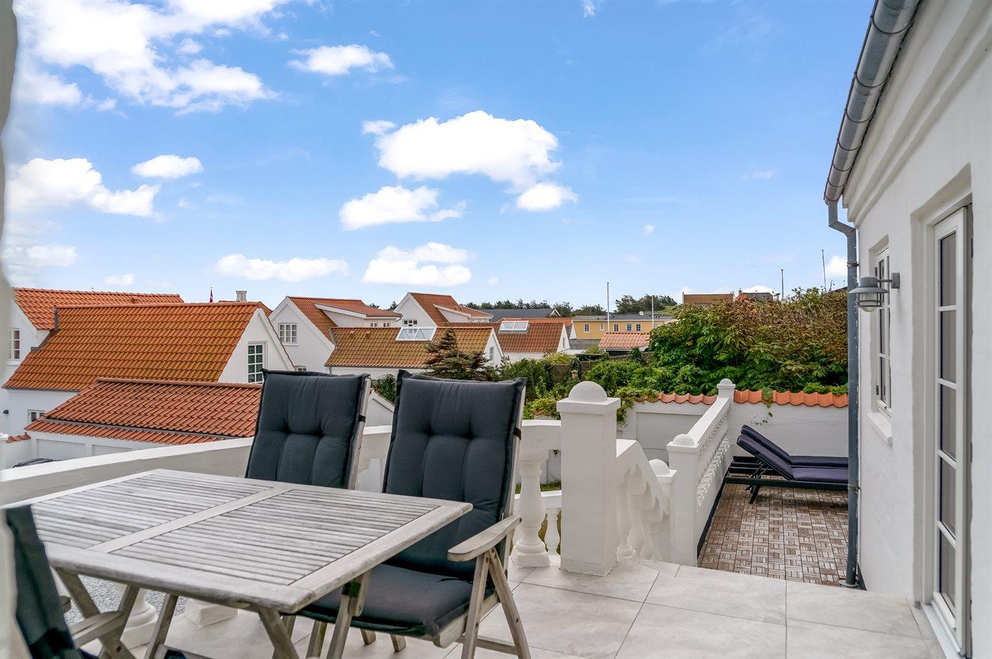 På terrassen kan man nyde en afslappet stund i et læfyldt hjørne med muligheder for at hygge og lave mad på grillen.