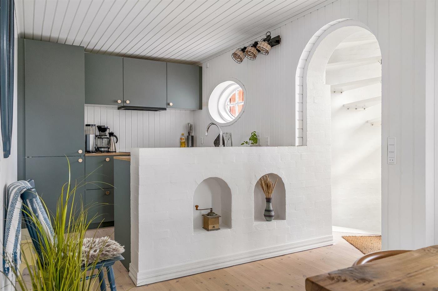 Køkkenet er udstyret med 1 køleskab. Der er 4 induktionskogeplader, varmluftovn samt opvaskemaskine.