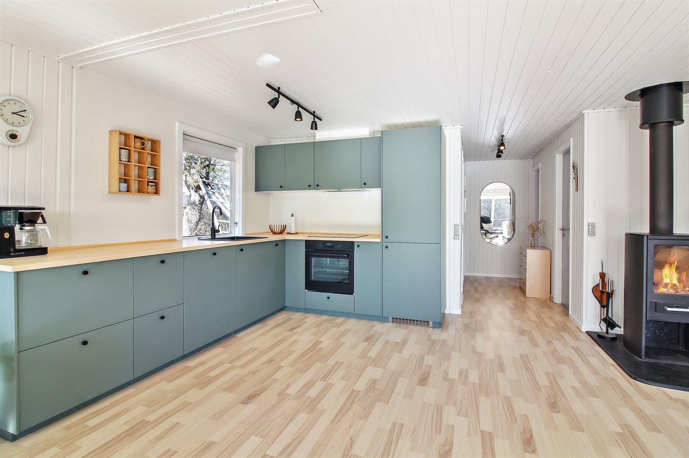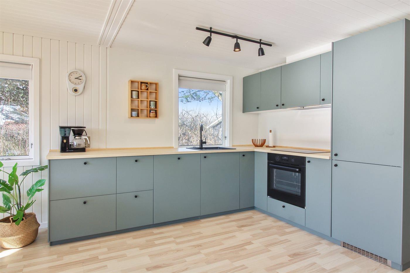 Køkkenet er udstyret med 1 køleskab. Der er 4 elkogeplader, varmluftovn, mikrobølgeovn samt opvaskemaskine.