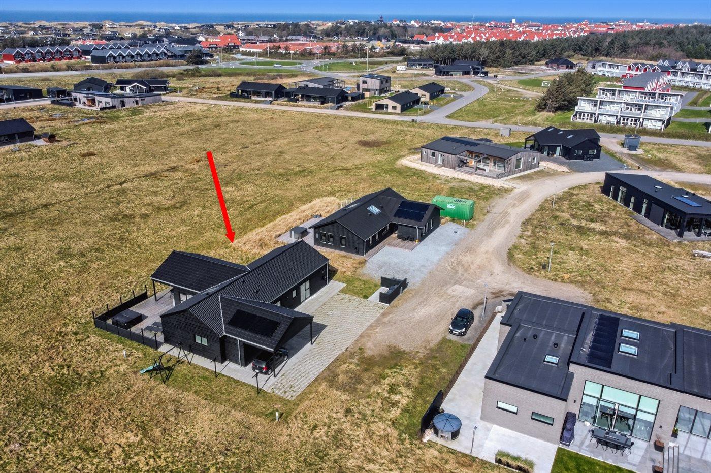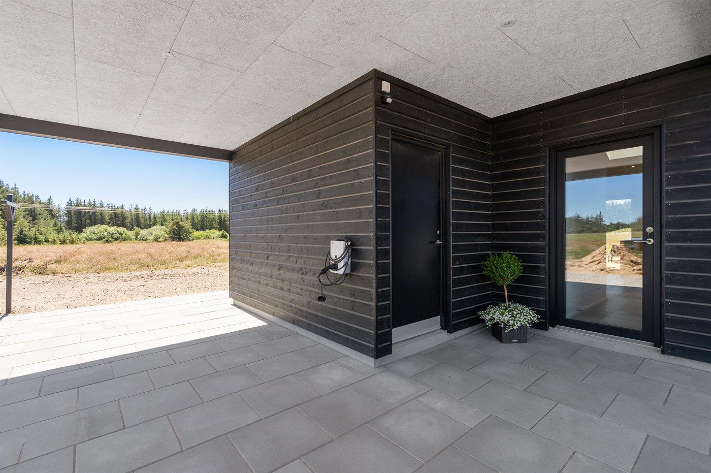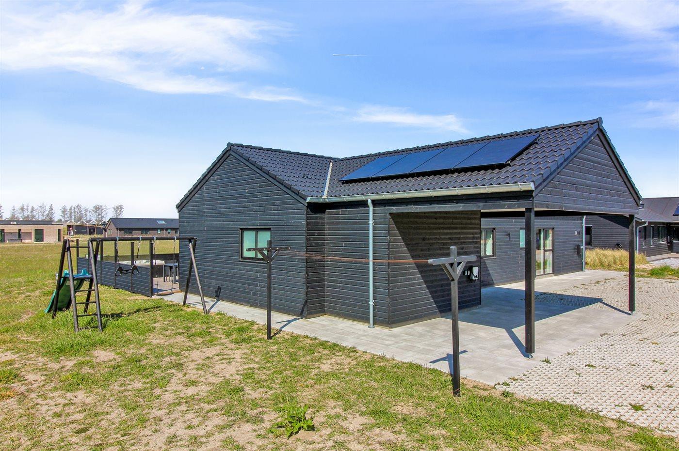 Ferieboligen er beliggende på en 595 m² stor naturgrund. Der er 950 m til havet. Nærmeste forretning er beliggende i en afstand af 800 m. Der er en golfbane i en afstand af 200 m. Til ferieboligen hører åbent terrasseareal. Desuden er der 21 m² overdækket terrasse. Gynge. Rutchebane. Udendørs bruser. Grill til rådighed. Der er carport til rådighed. Der er installeret stik til opladning af elbil. Parkering ved ferieboligen.