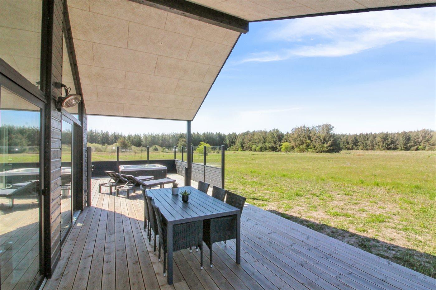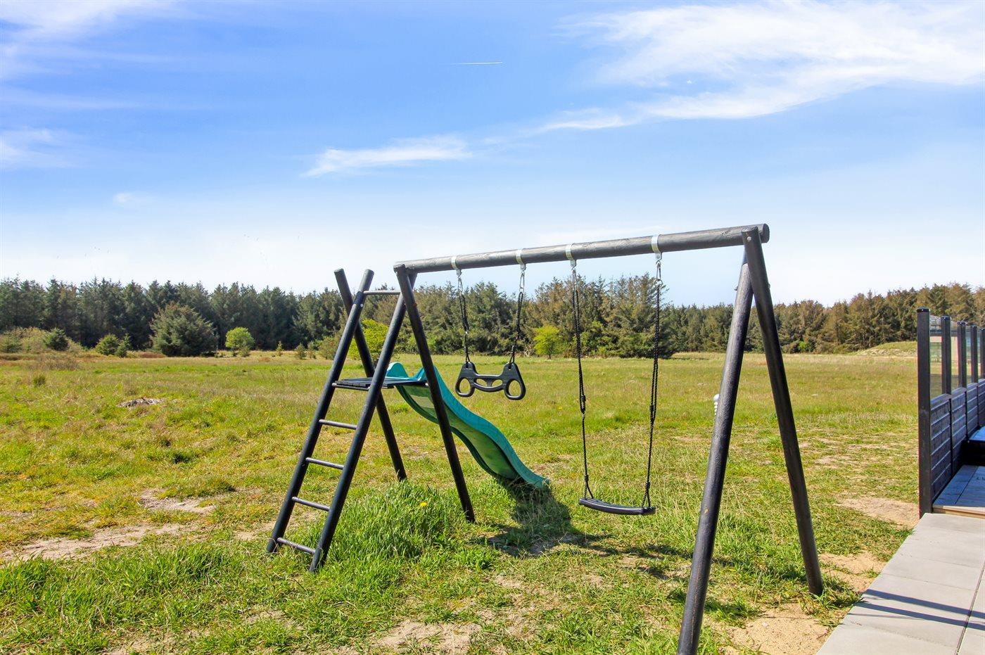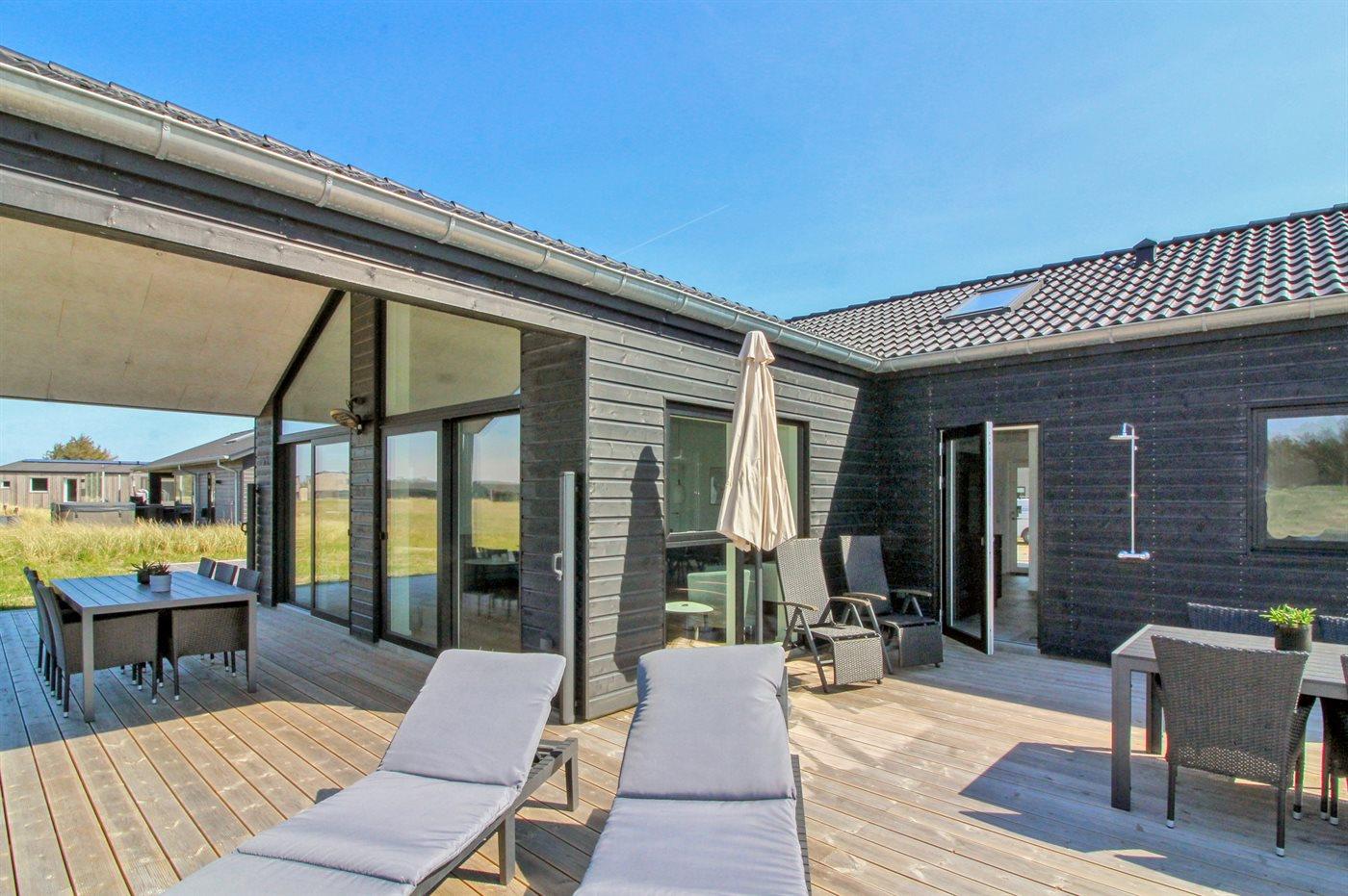 Ferieboligen er beliggende på en 595 m² stor naturgrund. Der er 950 m til havet. Nærmeste forretning er beliggende i en afstand af 800 m. Der er en golfbane i en afstand af 200 m. Til ferieboligen hører åbent terrasseareal. Desuden er der 21 m² overdækket terrasse. Gynge. Rutchebane. Udendørs bruser. Grill til rådighed. Der er carport til rådighed. Der er installeret stik til opladning af elbil. Parkering ved ferieboligen.
