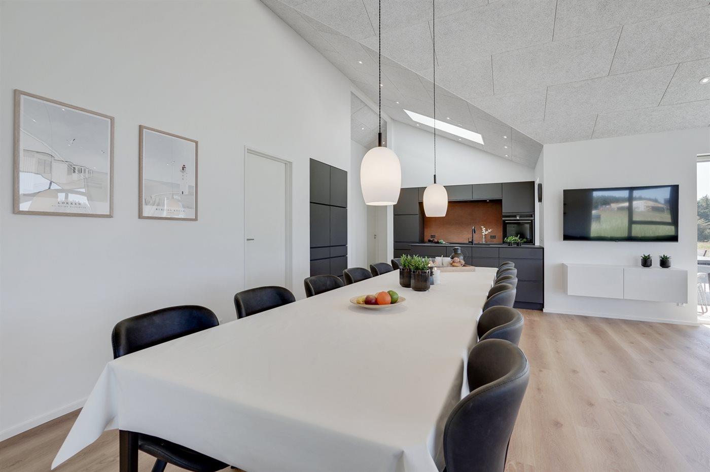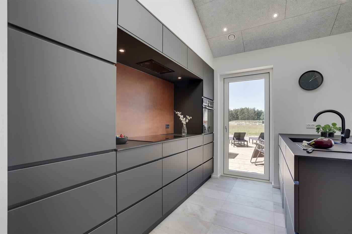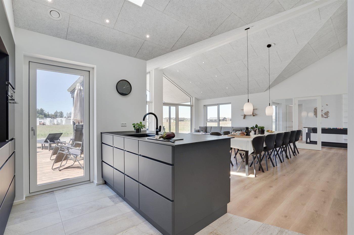 Køkkenet er udstyret med 1 køleskab. Der er 4 induktionskogeplader, varmluftovn, mikrobølgeovn samt opvaskemaskine.