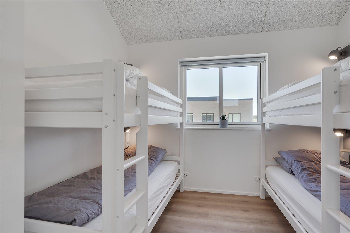 Der er i alt 4 soveværelser. Sovepladserne fordeler sig på: 6 sovepladser i dobbeltsenge. 4 sovepladser i køjesenge. 2 sovepladser på madrasser. 2 af disse sovepladser befinder sig på husets hems. Derudover er der 1 stk. barneseng.