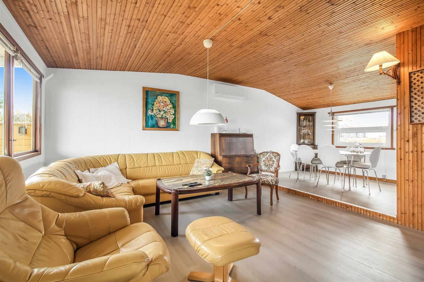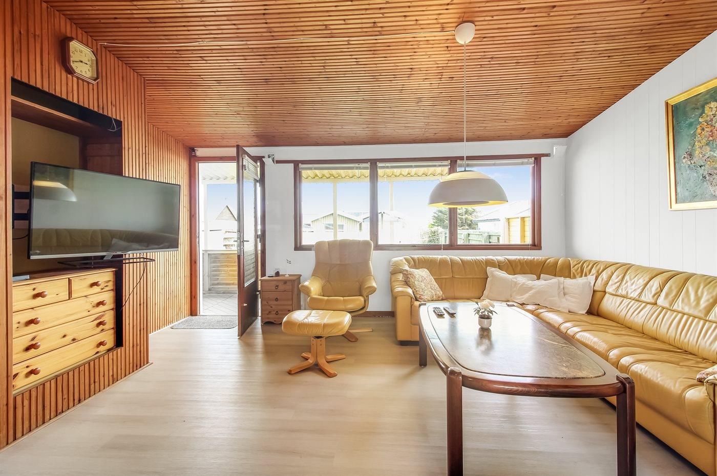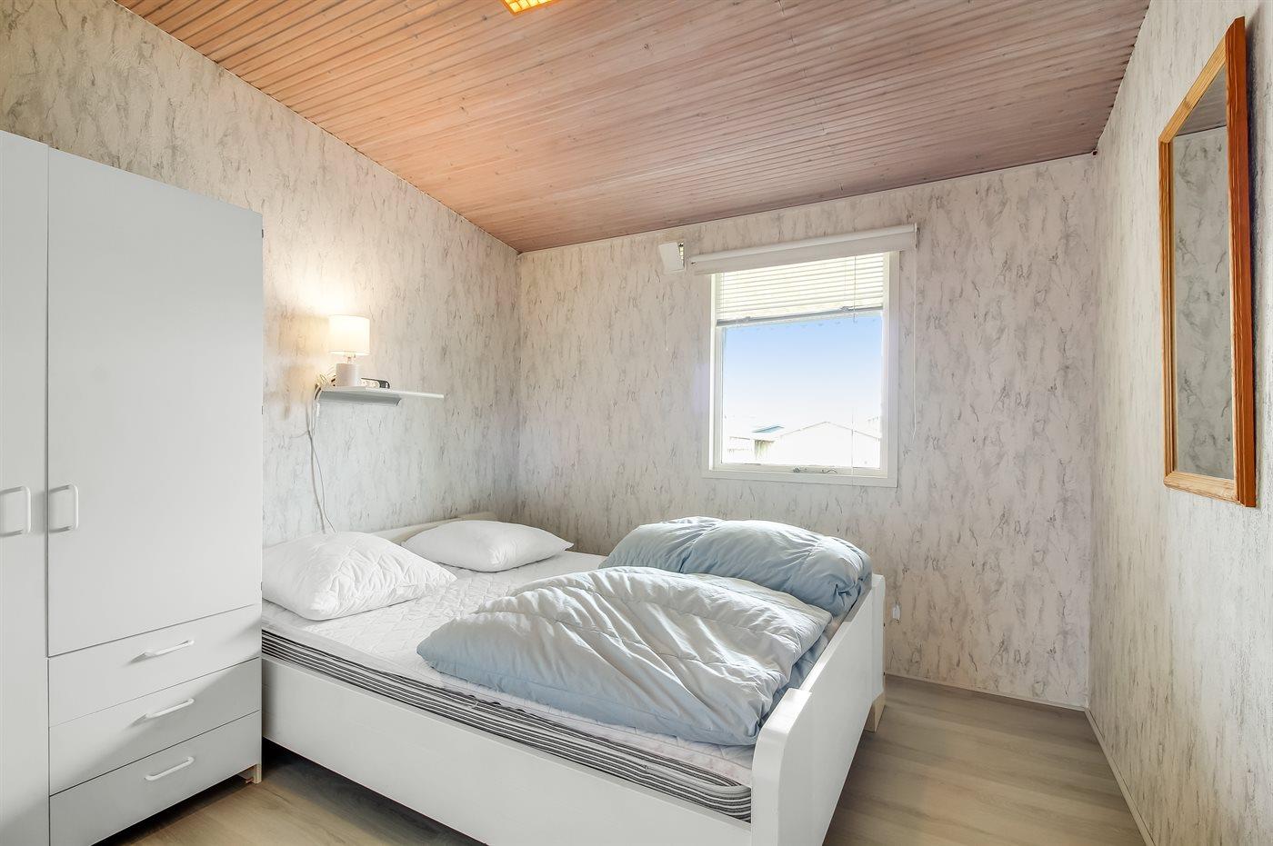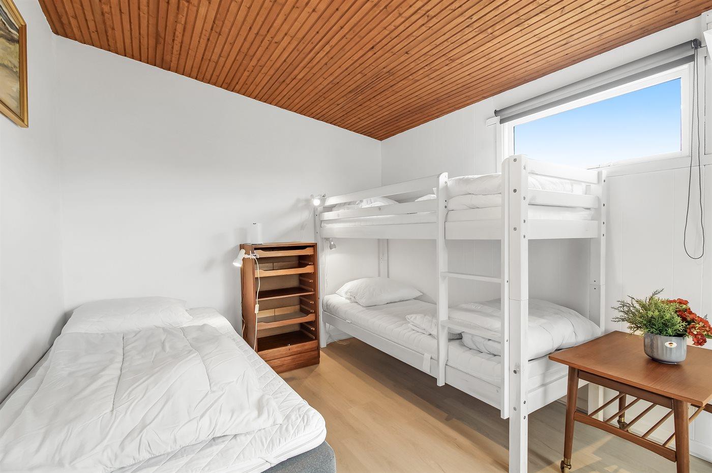 Der er i alt 2 soveværelser. Sovepladserne fordeler sig på: 2 sovepladser i dobbeltseng. 1 soveplads i enkeltseng. 2 sovepladser i køjeseng. 2 sovepladser i sovesofa (dobbelt). 2 af disse sovepladser befinder sig i stuen.