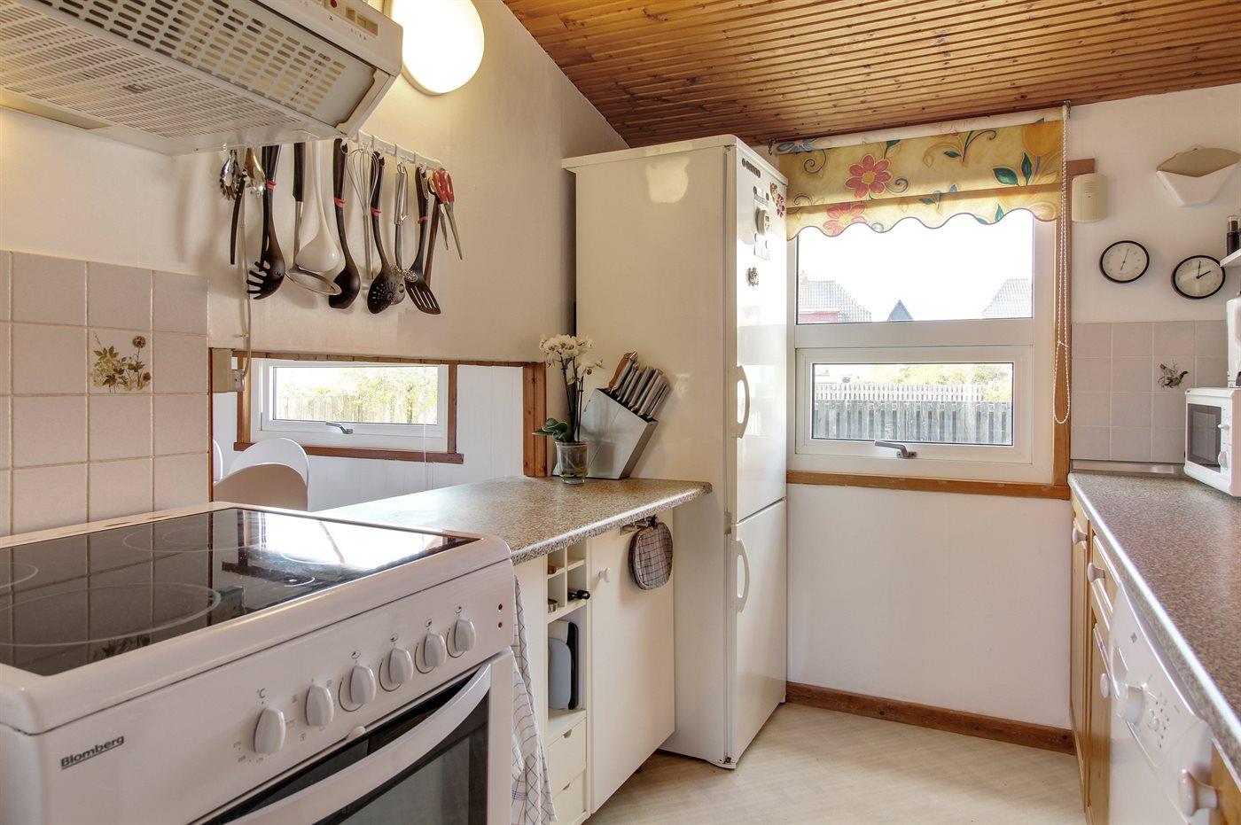 Køkkenet er udstyret med 2 køleskabe. Der er 4 keramiske kogeplader, varmluftovn, mikrobølgeovn samt opvaskemaskine.