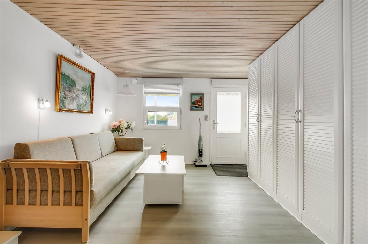 Et klassisk by-sommerhus med helt unik mulighed. Her er plads til flere generationer i et skønt hus beliggende på en privat vej i Løkken by. Selve huset fra 1937 er opdelt i 2 afdelinger med hver sin indgang, stue, soveværelse og toilet. I den ene stue er der sovesofa, ligesom der også er et lille the-køkken med eget køleskab.