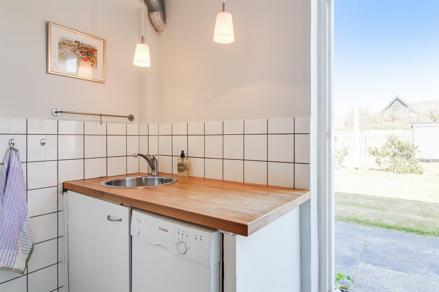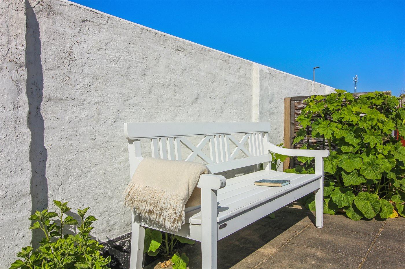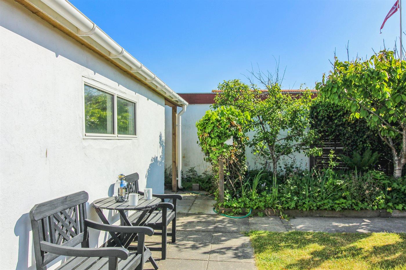 Grunden er indhegnet og der er masser af plads til bil, cykler og evt. surfboards. Haven og vaskerummet deles med gæsterne på 1. sal. Ude i haven er der masser af havemøbler, så der skulle være fin mulighed for at hygge og nyde en kop kaffe eller et glas vin i den store have.