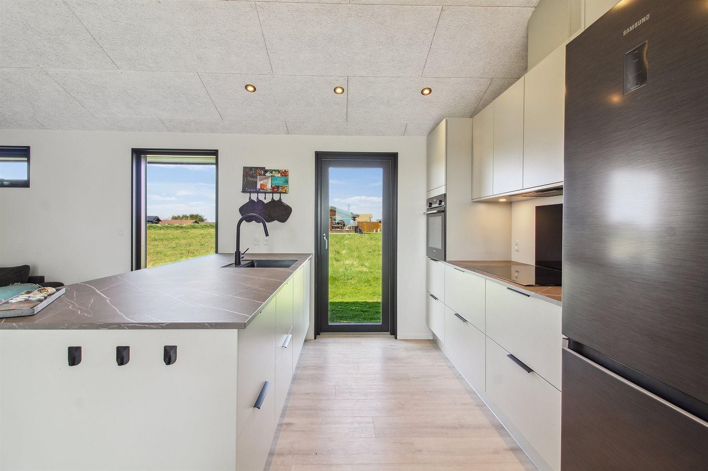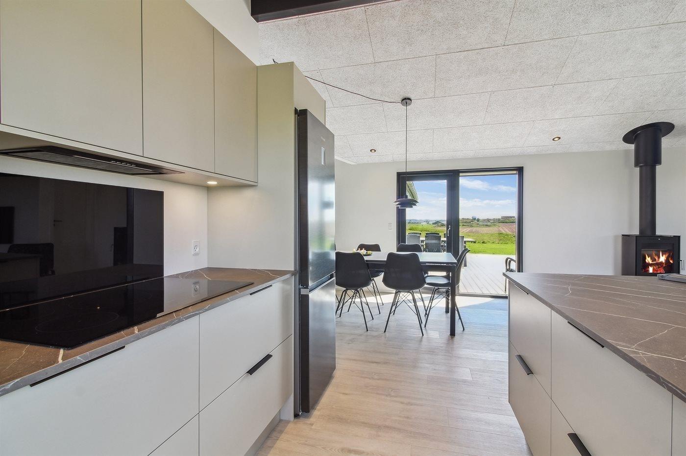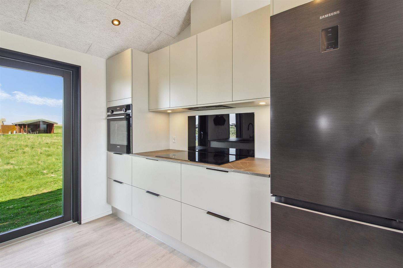 Køkkenet er udstyret med 1 køleskab. Der er 4 induktionskogeplader, varmluftovn samt opvaskemaskine.
