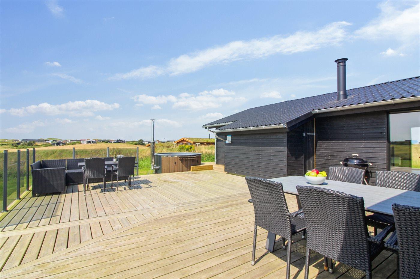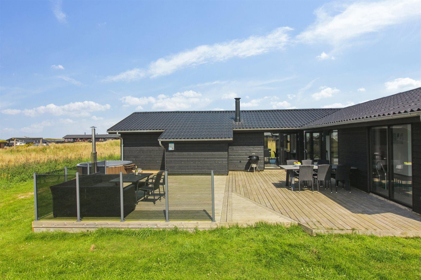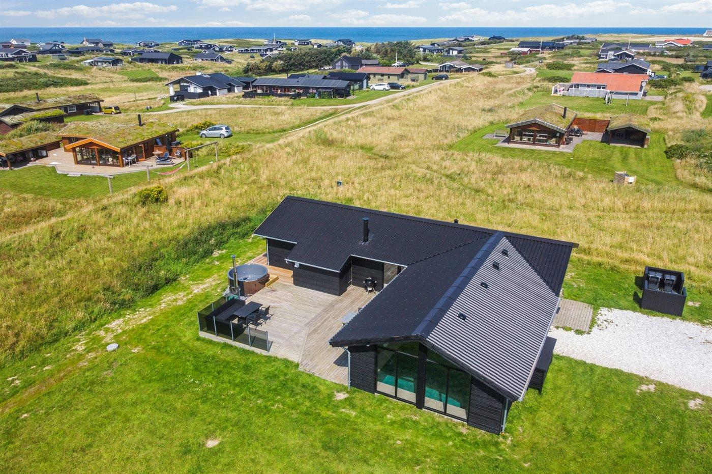 Ferieboligen er beliggende på en 1260 m² stor naturgrund. Der er 500 m til havet. Nærmeste forretning er beliggende i en afstand af 2000 m. Der er en golfbane i en afstand af 5500 m. Til ferieboligen hører åbent terrasseareal. Der er redskabsrum. Grill til rådighed. Der er installeret stik til opladning af elbil. Type 2 stik. Parkering ved ferieboligen.
