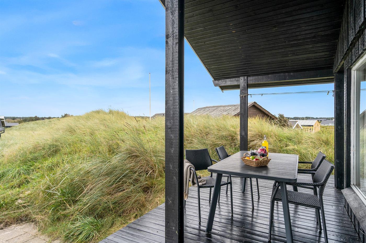 Til sommerhuset hører en stor træterrasse, som omgiver huset – her kan du nyde morgen-, middag- og aftensolen samt udsigten til den helt fantastiske solnedgang.