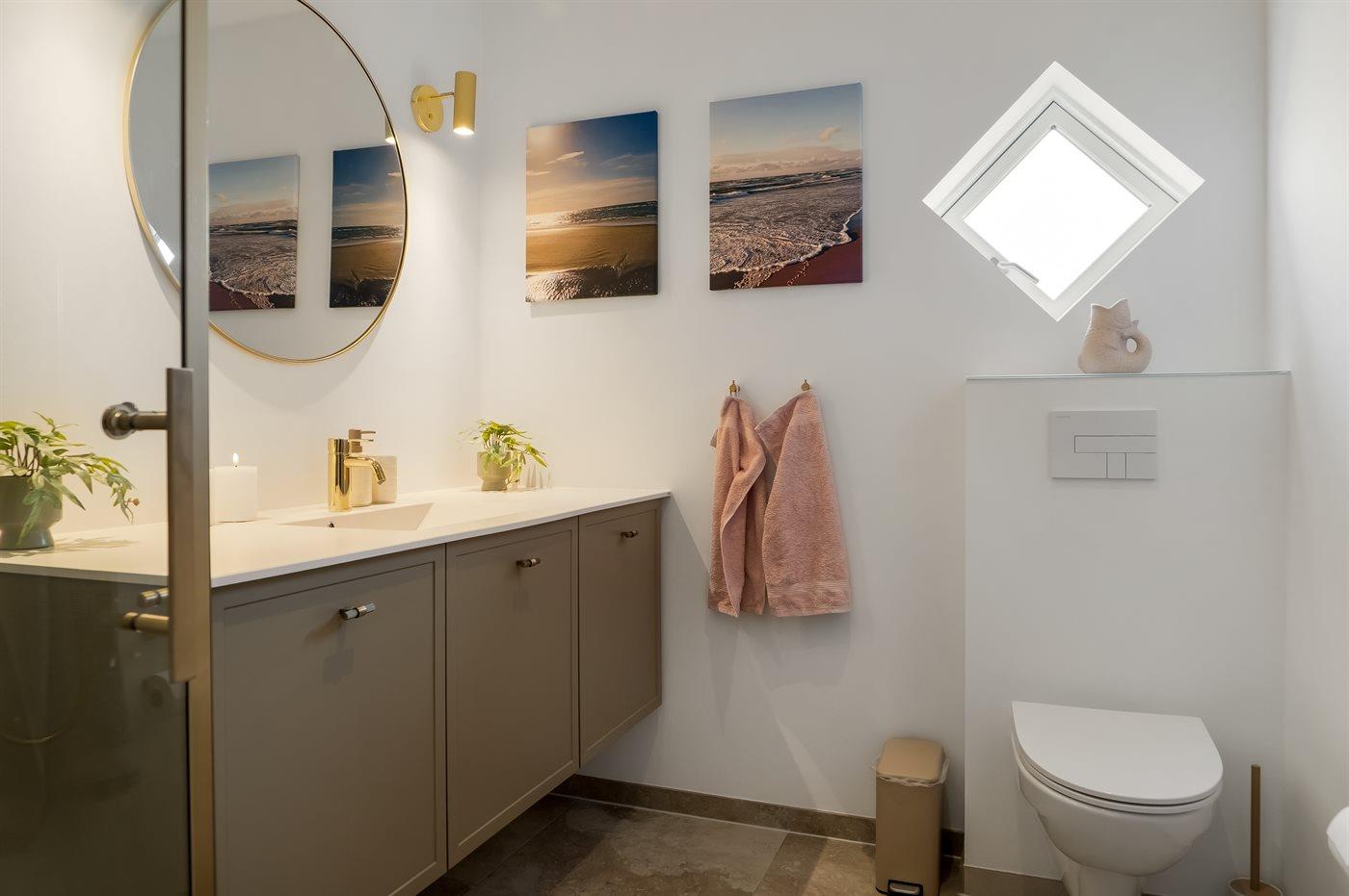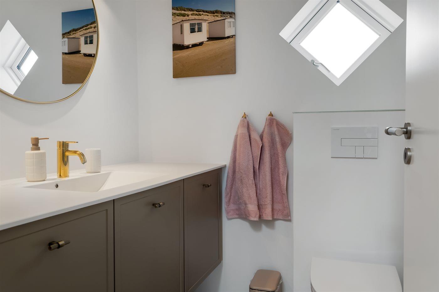 Der er 1 badeværelse med bruseniche og 2 toiletter, heraf 1 gæstetoilet. Der er gulvvarme på 1 badeværelse. Der er gulvvarme på gæstetoilettet.