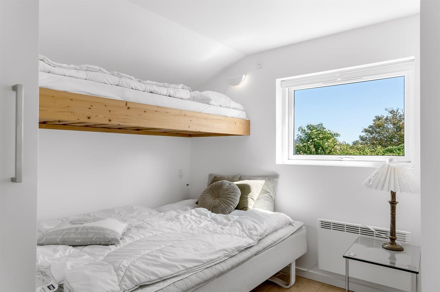 Der er i alt 3 soveværelser. Sovepladserne fordeler sig på: 4 sovepladser i dobbeltsenge. 3 sovepladser i køjesenge. 1 soveplads på madras. 1 af disse sovepladser befinder sig på husets hems.