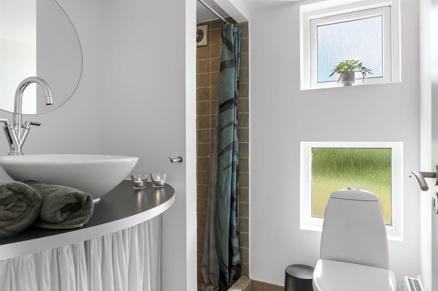 Der er 2 badeværelser med bruseniche og 2 toiletter. Der er gulvvarme på 2 badeværelser. I saunaen er der mulighed for afslapning.