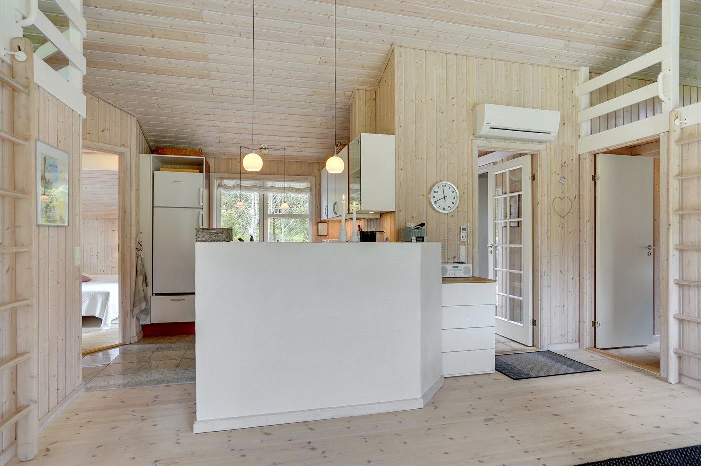 Køkkenet er udstyret med et køleskab. Der er fire induktionskogeplader, varmluftovn, mikrobølgeovn samt opvaskemaskine.