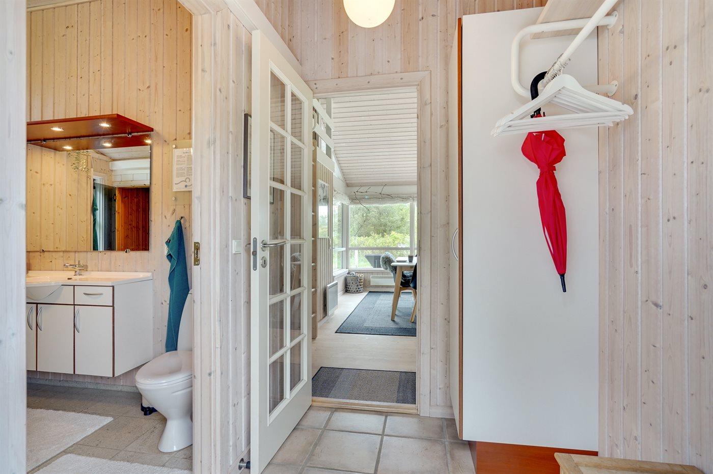 Der er et badeværelse med bruseniche og toilet. Desuden er der sauna samt en spa til 2 personer og der er således fine muligheder for wellness og afslapning.