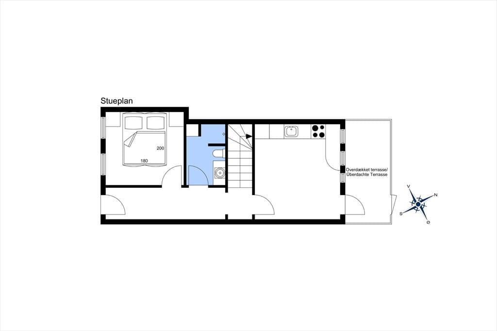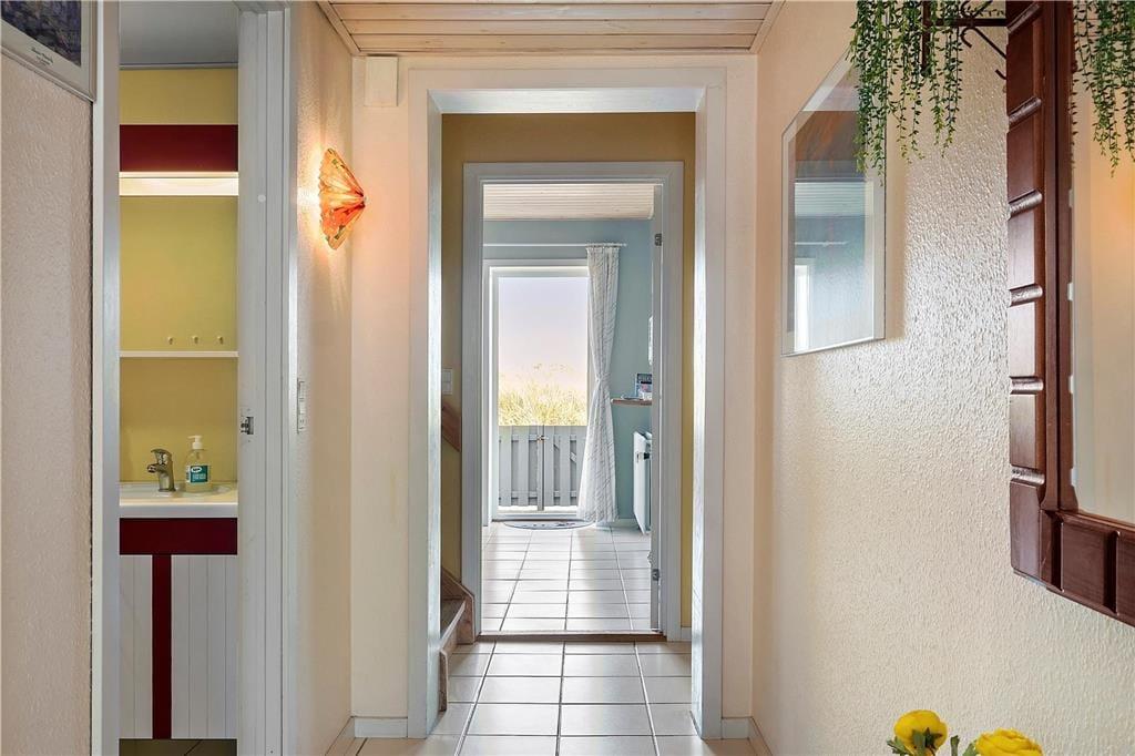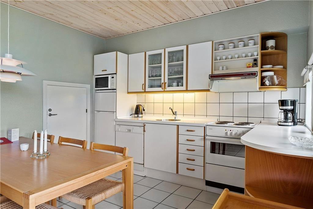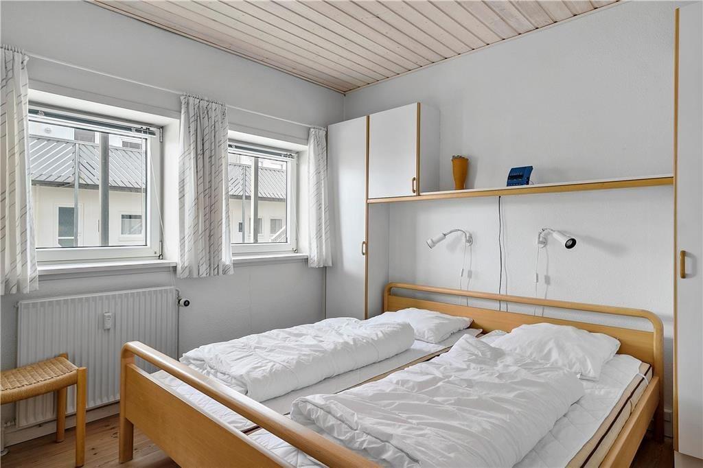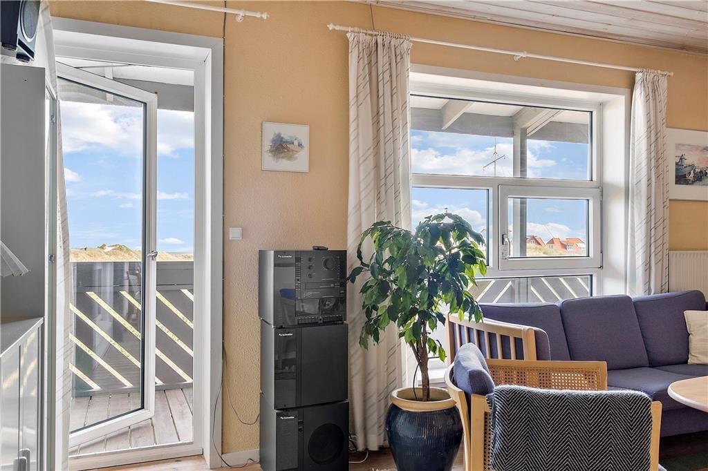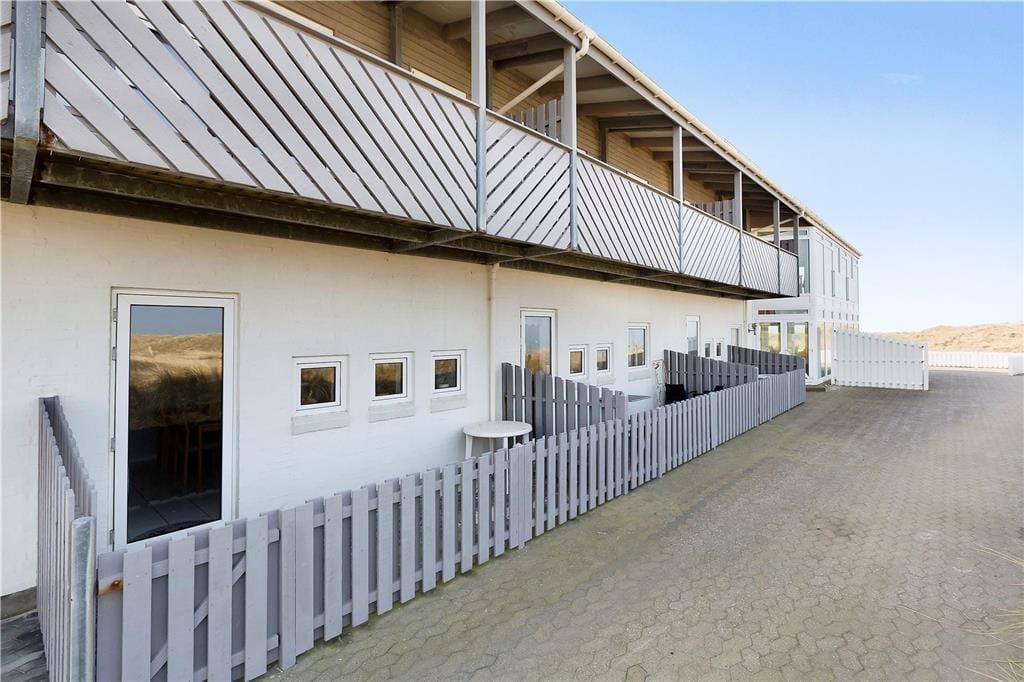 Ferielejligheden er velholdt og gennem årene delvist moderniseret. Den råder over fire sovepladser og er derfor velegnet til både en lille familie og et enkelt eller to par, som gerne vil holde ferie sammen. I stueetagen finder man entre, et stort soveværelse, badeværelse med bruseniche og spisekøkken med udgang til terrasse. På 1.salen er endnu et soveværelse og et hyggeligt opholdsrum med tv og udgang til en stor balkon. Har man brug for at vaske og tørre tøj til de mange badeture i Vesterhavet, er der vaskemaskine og tørretumbler til møntindkast i fællesrummet, og på parkeringspladsen står bilen trygt fra feriens start til slut. Alt i alt en brugbar og ideel base for en god ferie i det nordjyske.