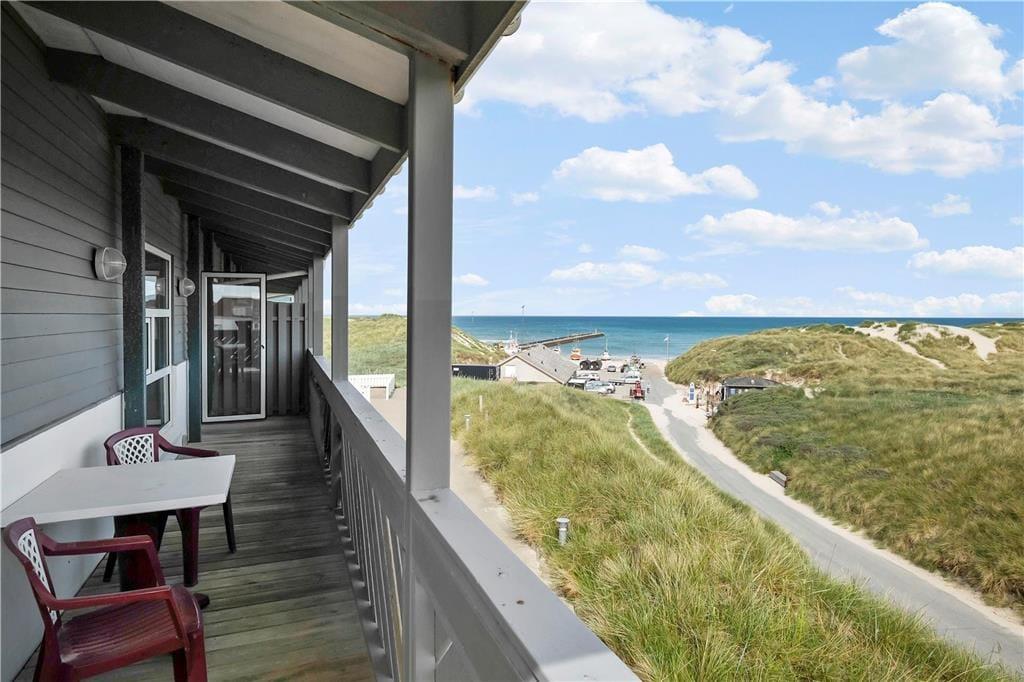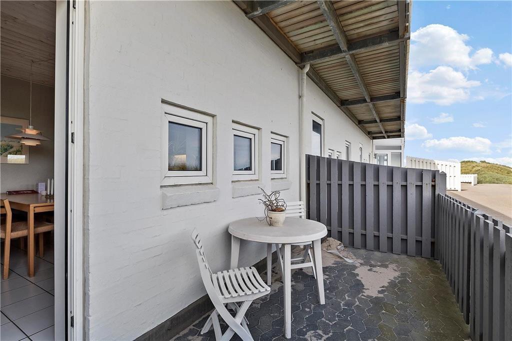 Mod nordhar man i stueetagen en skøn terrasse med udsigt til klitterne og havet, mens man fra opholdsrummet på 1.salen går ud på en stor balkon i det nordøstlige hjørne. Her er god læ for Vestenvinden og sol fra morgen til omkring middagstid, så det er oplagt at nyde morgenkaffen og rundstykkerne her. Samtidig kan man lade blikket glide hen over Vesterhavet til den ene side og hen over Løkkens tagtoppe, Vandtårnet, Signalmasten og den nye mole til den anden side.