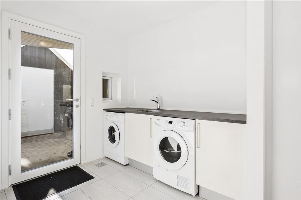 Udenfor venter en stor, delvist overdækket terrasse, som er ideel til både afslapning og hyggelige måltider under åben himmel. Den store græsplæne giver plads til leg og aktiviteter, og den rolige beliggenhed giver en skøn og afslappende atmosfære. På den store terrasse kan du nyde de lange sommeraftener med en god bog eller et glas vin, mens du lytter til naturens lyde. Den rummelige udendørsplads giver desuden mulighed for at oplade din elbil, hvis du har det rette stik med hjemmefra, så du nemt kan tage på opdagelse i de omkringliggende områder.