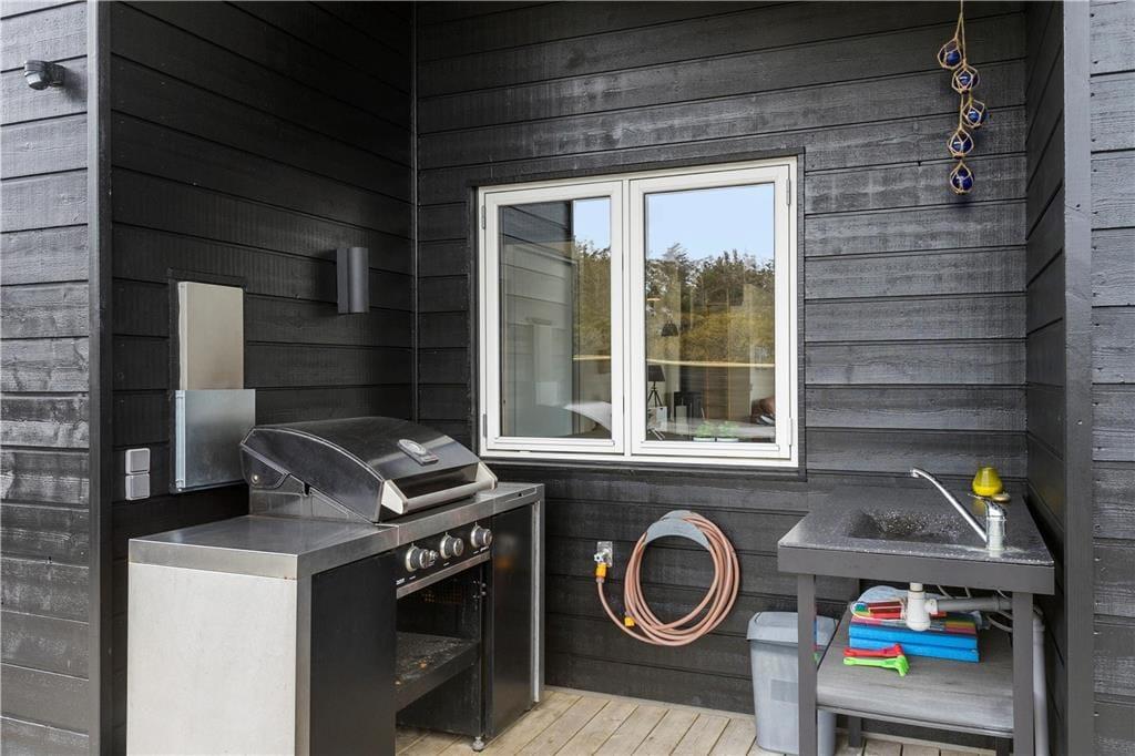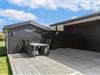 Ved sommerhuset er der anlagt en stor terrasse med god plads til at nyde sommerlivet på solsenge og tilberede lækkert mad på grillen. Der er desuden et udekøkken med håndvask til rådighed. En del af terrassen er lukket, så man kan nyde roen. I dette område er der også udendørs bruser med varmt vand, og adgang til en sauna i det tilhørende anneks. Ydermere er haven indhegnet med et 90 cm. højt hundehegn.