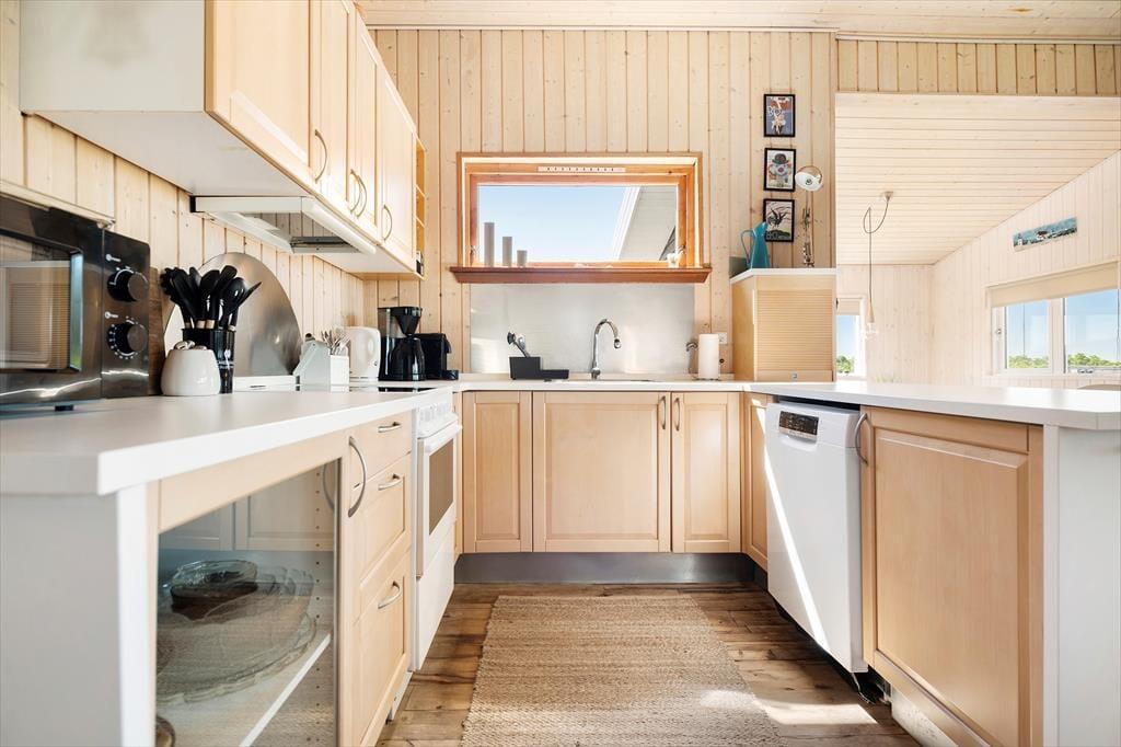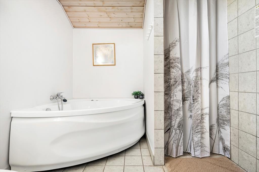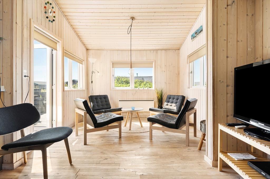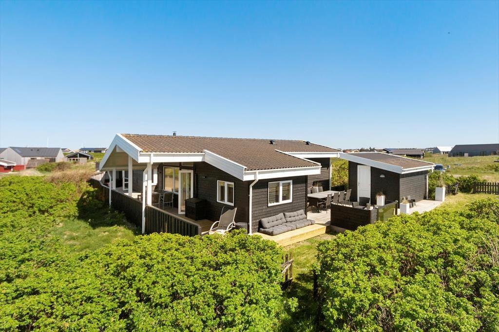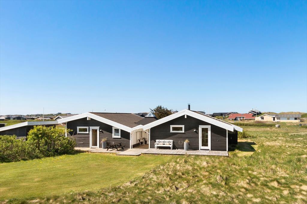 Huset er velholdt og består af to sammenhængende huse, begge med værelser, bad og opholdsrum og et fælles køkken. Indretningen gør, at man kan dele sig op eller lave forskellige aktiviteter sammen, alt efter ønsker og humør. Her er i alt plads til otte overnattende gæster, og med spabad, brændeovn og gratis internet er der lagt op til mange hyggelige stunder i det familievenlige hus. Køkkenet er udstyret med gode hårde hvidevarer, og på det ene badeværelse er vaskemaskine og tørretumbler, så man kan få vasket badetøj og håndklæder under opholdet. Desuden et tredje badeværelse med adgang fra terrassen og toilet og håndbruser, god at bruge efter en dukkert i Vesterhavet.