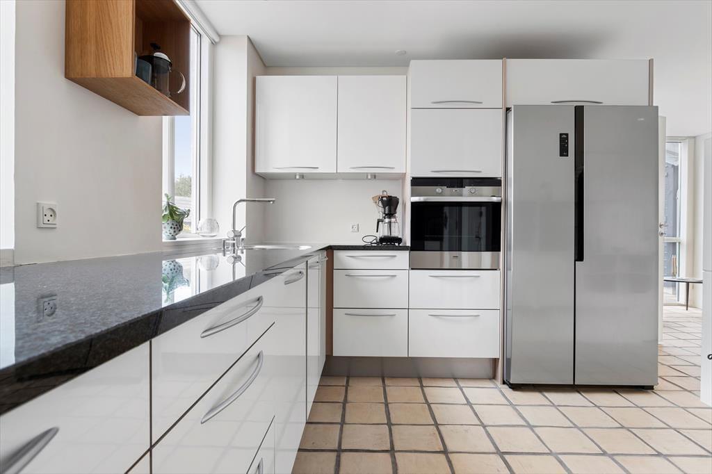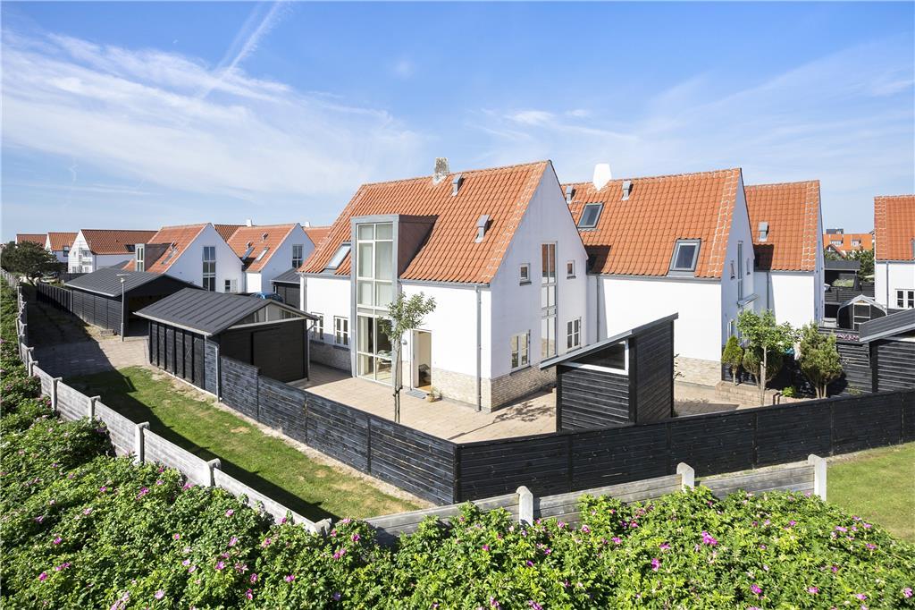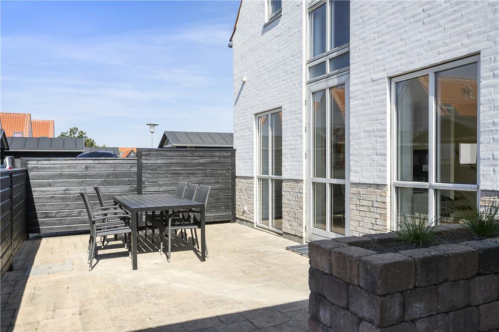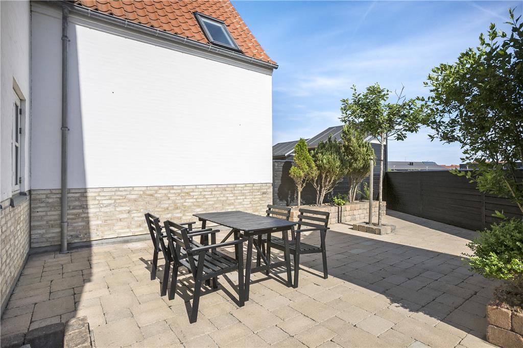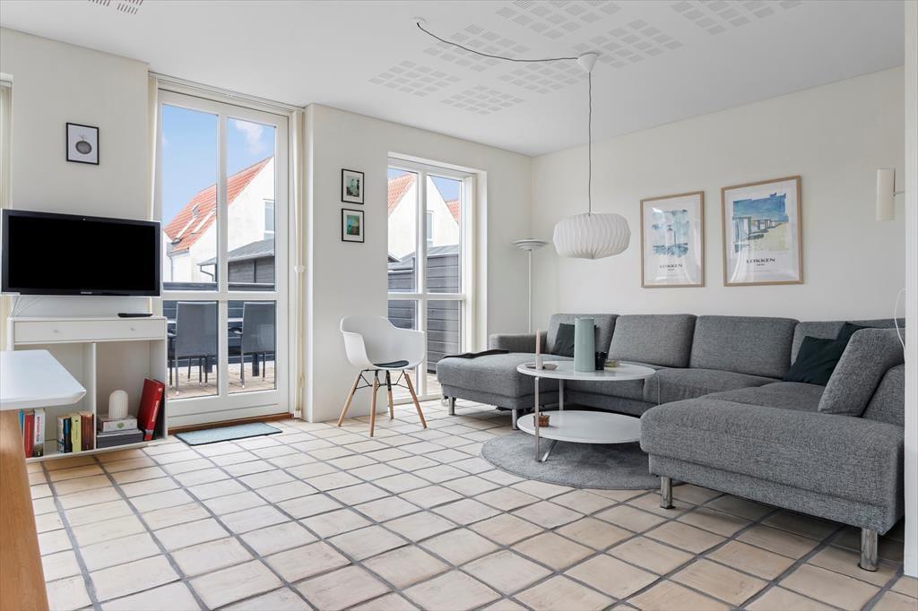 Huset er beliggende for enden af vejen, hvilket betyder at det er ugeneret og med flere gode terrasser. Fra stuen er der adgang til en dejlig sydvendt terrasse og på den anden side er der lavet et hyggeligt aflukket gård-miljø, hvilket altid gør det muligt at finde sol, skygge eller læ. Huset er placeret meget tæt på centrum af Løkken og der er ikke langt til stranden, hvor man i løbet af dagen kan være heldig at få fat i helt friskfangede fisk til aftensmaden. Der er havemøbler, liggestole og grill til rådighed og det er muligt at benytte husets carport samt parkere med en ekstra bil.