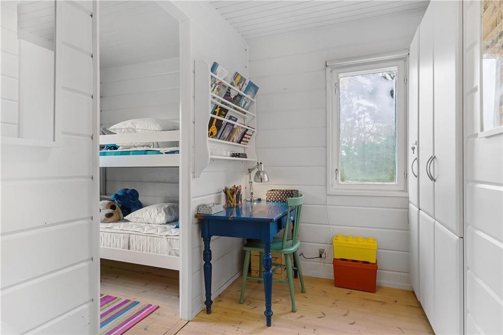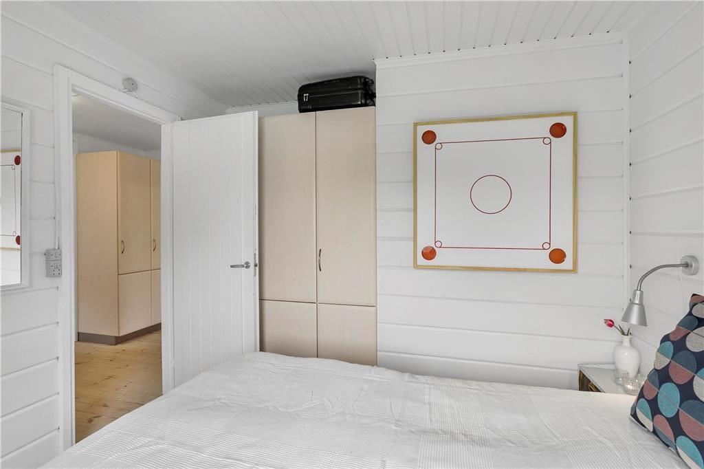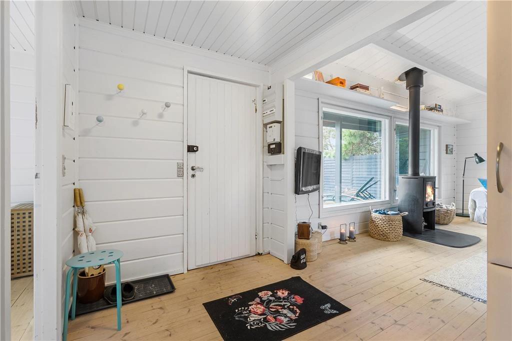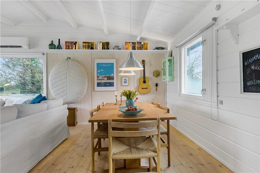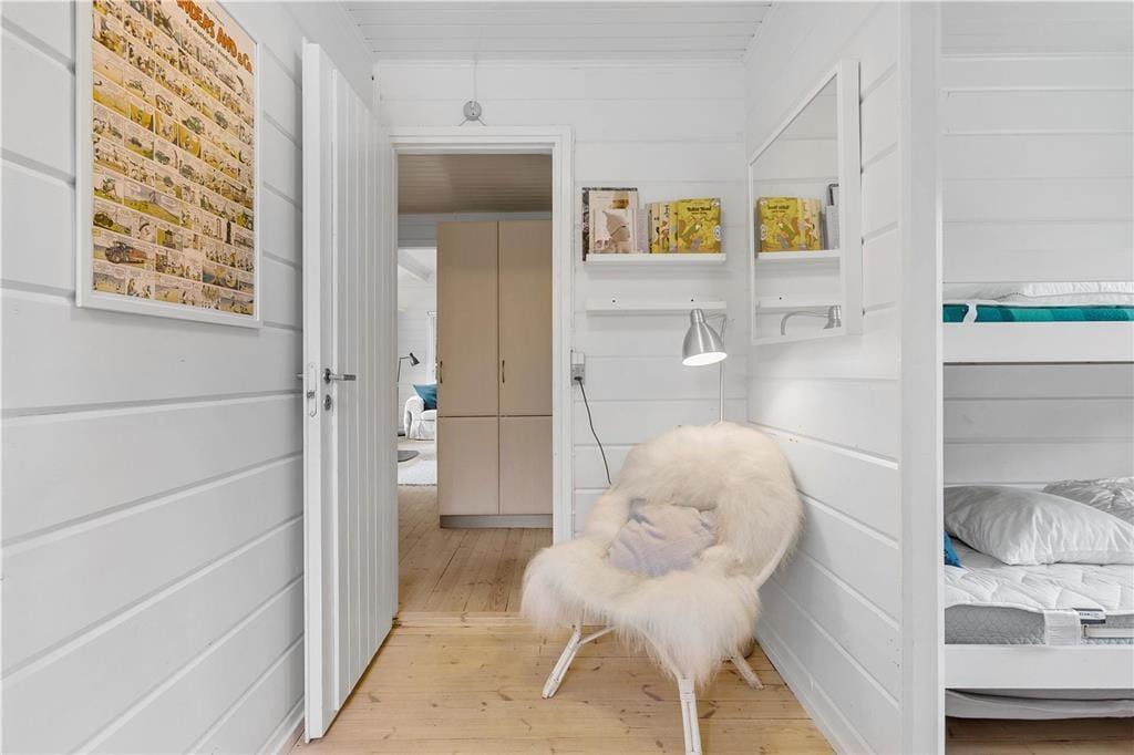 Træsommerhuset, som er opført i 1972, har heldigvis fået lov til at bevare sin klassiske charme – samtidig med, at det er blevet vedligeholdt, opdateret og indrettet med moderne inventar. Den gode balance skaber en særligt hyggelig atmosfære i rummene, og de store vinduespartier bidrager med et godt lysindfald og udsigt til grundens grønne beplantning. Planløsningen består kort fortalt af en stue med integreret køkken, et badeværelse og to soveværelser, der rummer henholdsvis en dobbeltseng og to køjesenge. Derfor er der plads til i alt seks personer, som alle kan samles i stuen, når det er tid til en god frokost, sjove brætspil eller en tilbagelænet filmaften med ild i brændeovnen.