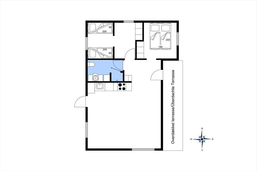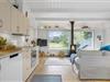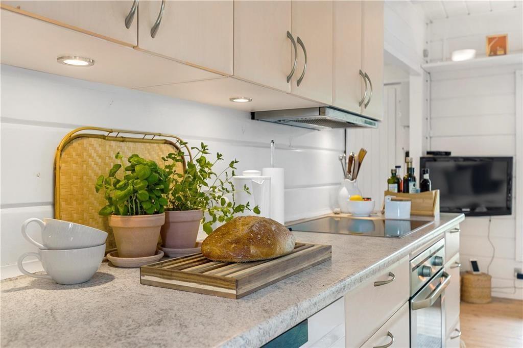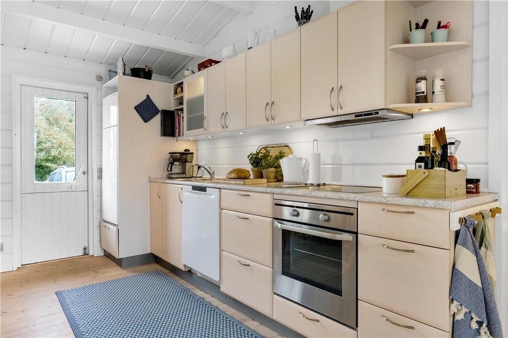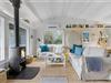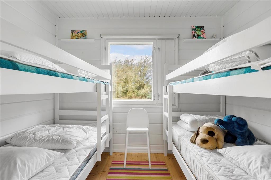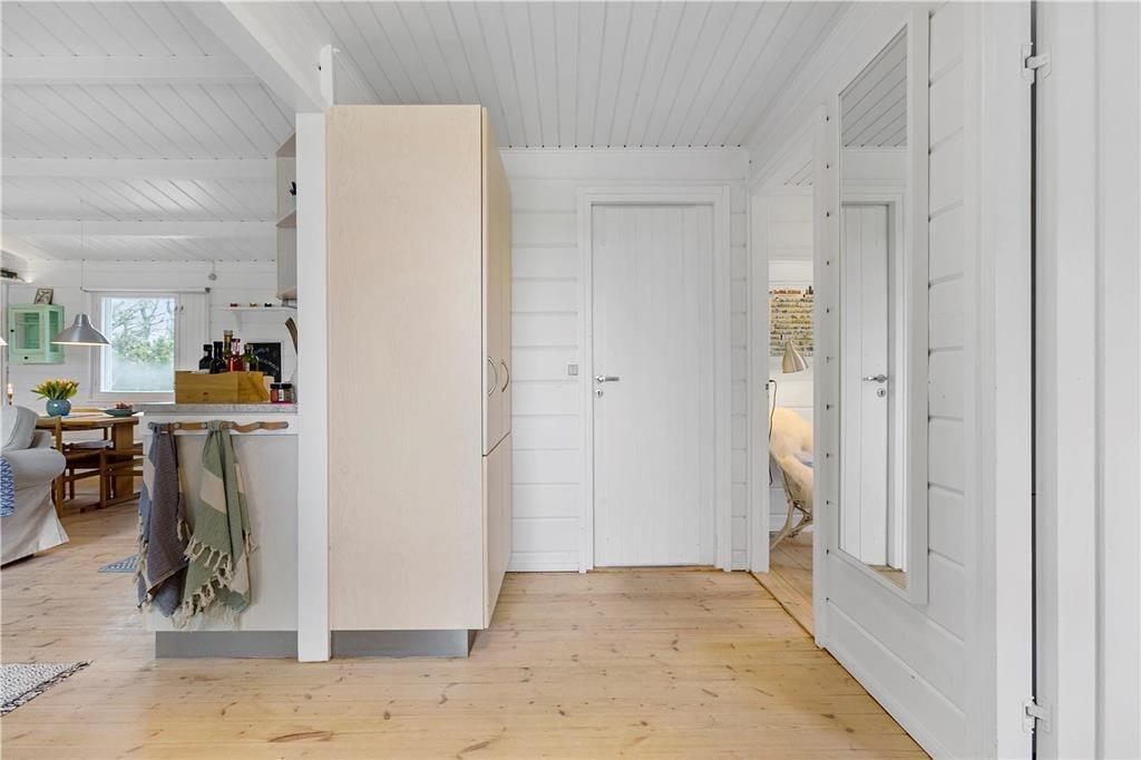 Træsommerhuset, som er opført i 1972, har heldigvis fået lov til at bevare sin klassiske charme – samtidig med, at det er blevet vedligeholdt, opdateret og indrettet med moderne inventar. Den gode balance skaber en særligt hyggelig atmosfære i rummene, og de store vinduespartier bidrager med et godt lysindfald og udsigt til grundens grønne beplantning. Planløsningen består kort fortalt af en stue med integreret køkken, et badeværelse og to soveværelser, der rummer henholdsvis en dobbeltseng og to køjesenge. Derfor er der plads til i alt seks personer, som alle kan samles i stuen, når det er tid til en god frokost, sjove brætspil eller en tilbagelænet filmaften med ild i brændeovnen.