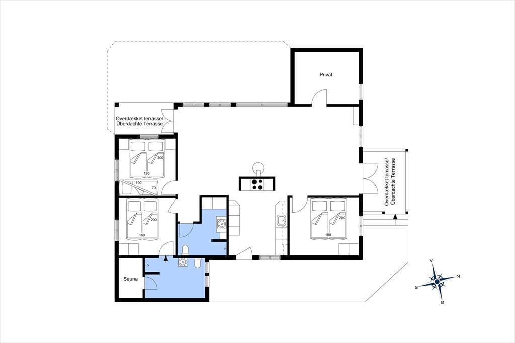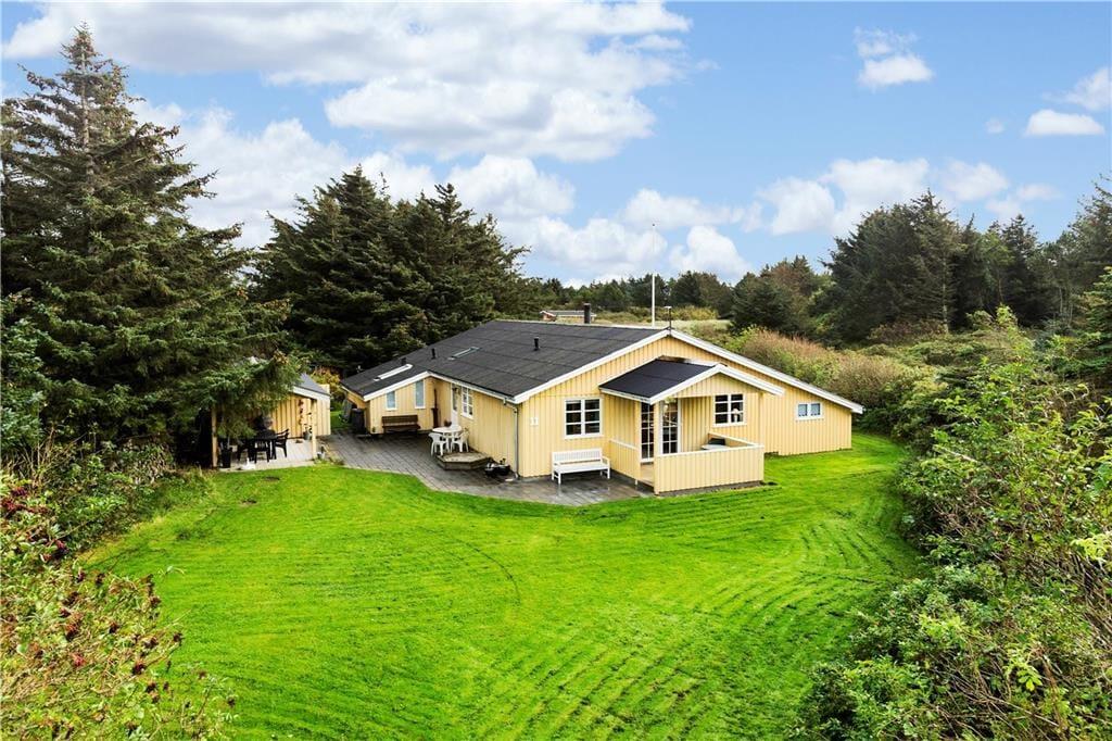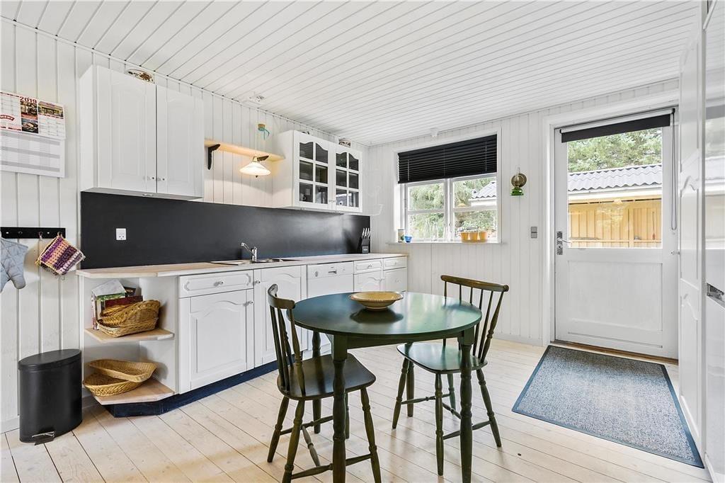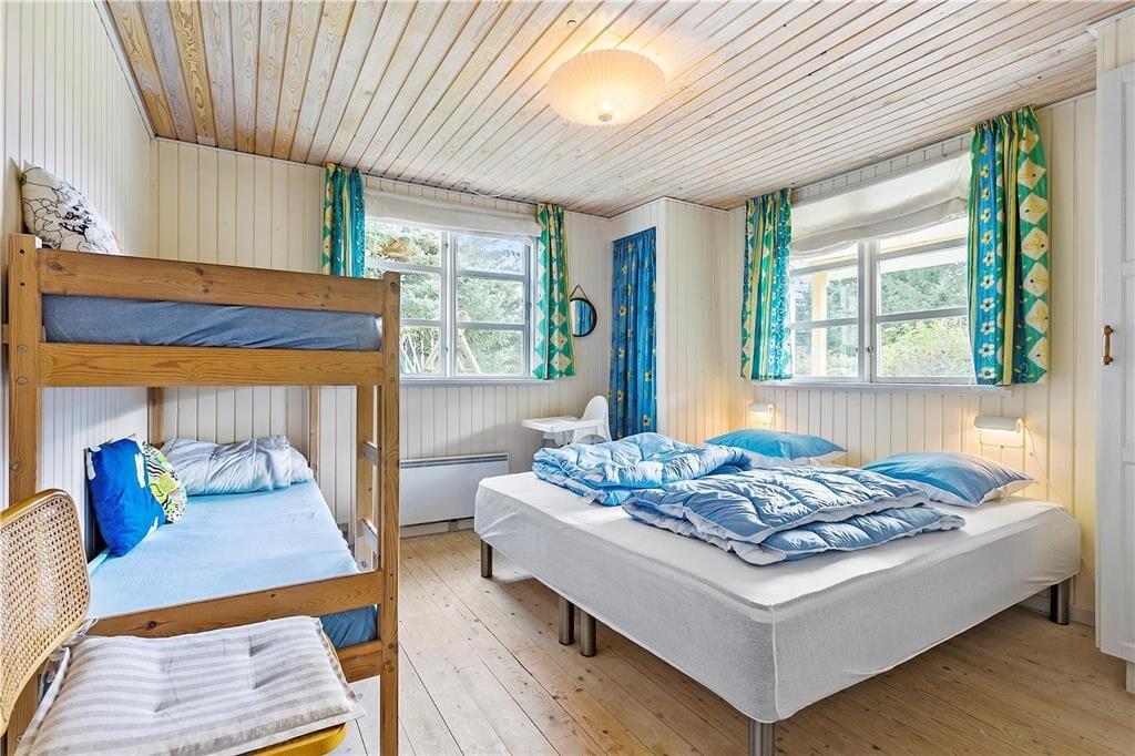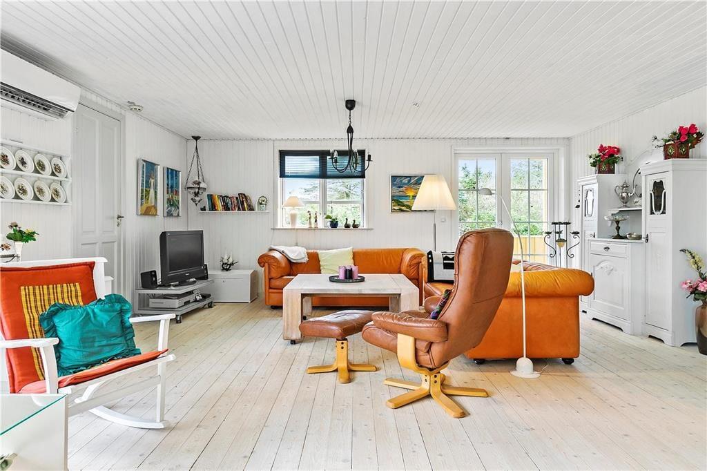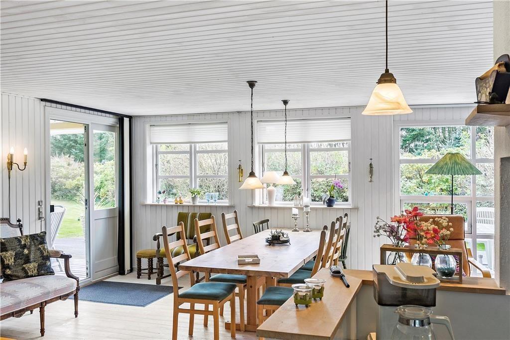 Inden døre i det gulmalede træsommerhus passer møblementet perfekt ind i de lyse rum, der består af tre soveværelser, to badeværelser og en dejlig stue med integreret køkken. I alt er der hele 130 m2 at brede sig på, og særligt opholdsafdelingen er dejligt rummelig med mange gode siddepladser og hyggekroge. For eksempel kan morgenkaffen indtages ved det lille spisebord i det veludstyrede køkken, mens aftensmåltidet kan serveres ved langbordet i stuen – måske endda med ild i brændeovnen, hvis vejret indbyder til det. Trænger I til at blive varmet ordentligt igennem, er det også muligt at tage en tur i saunaen, der ligger i forlængelse af det ene badeværelse.