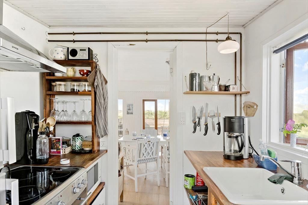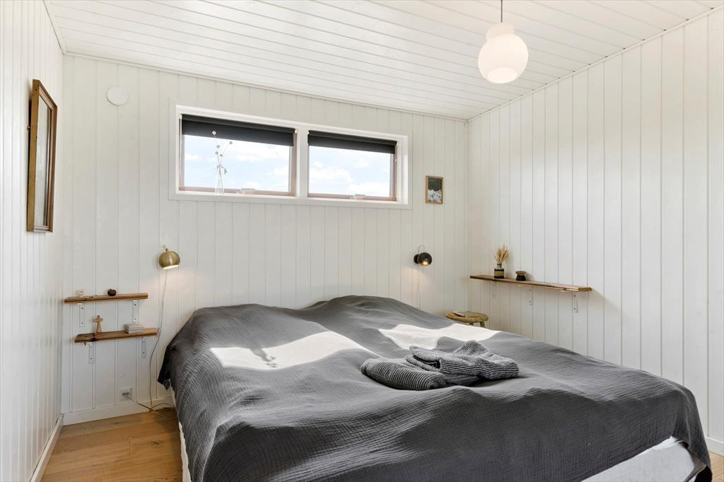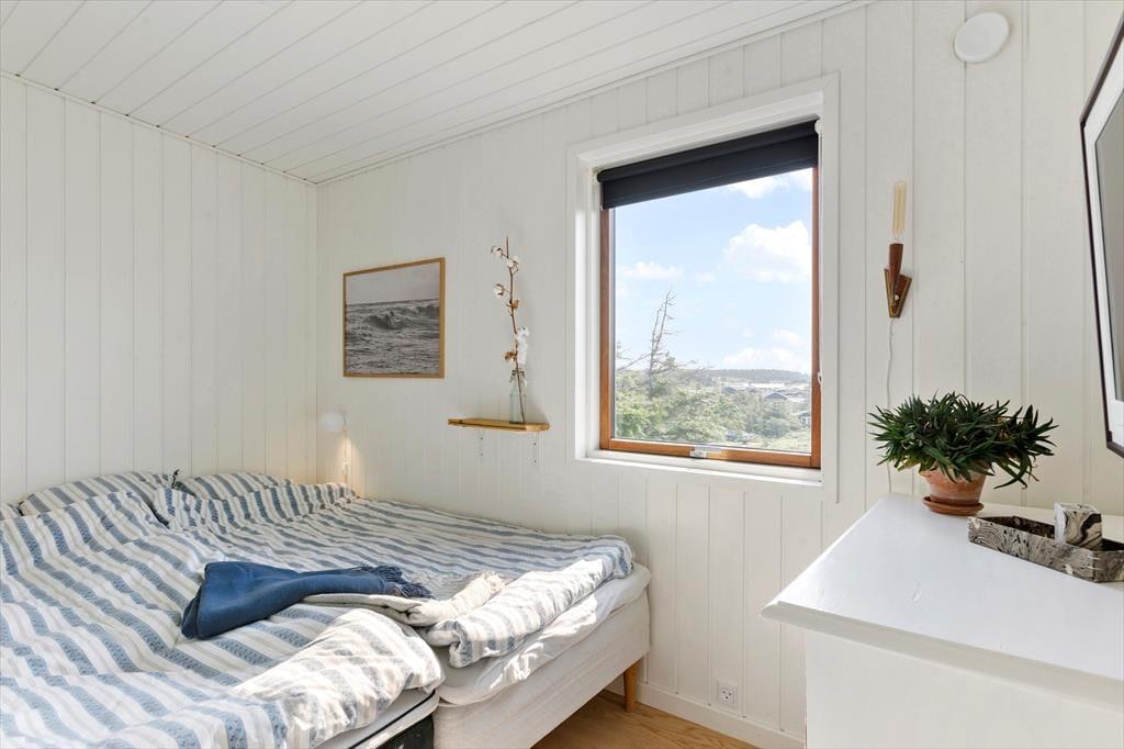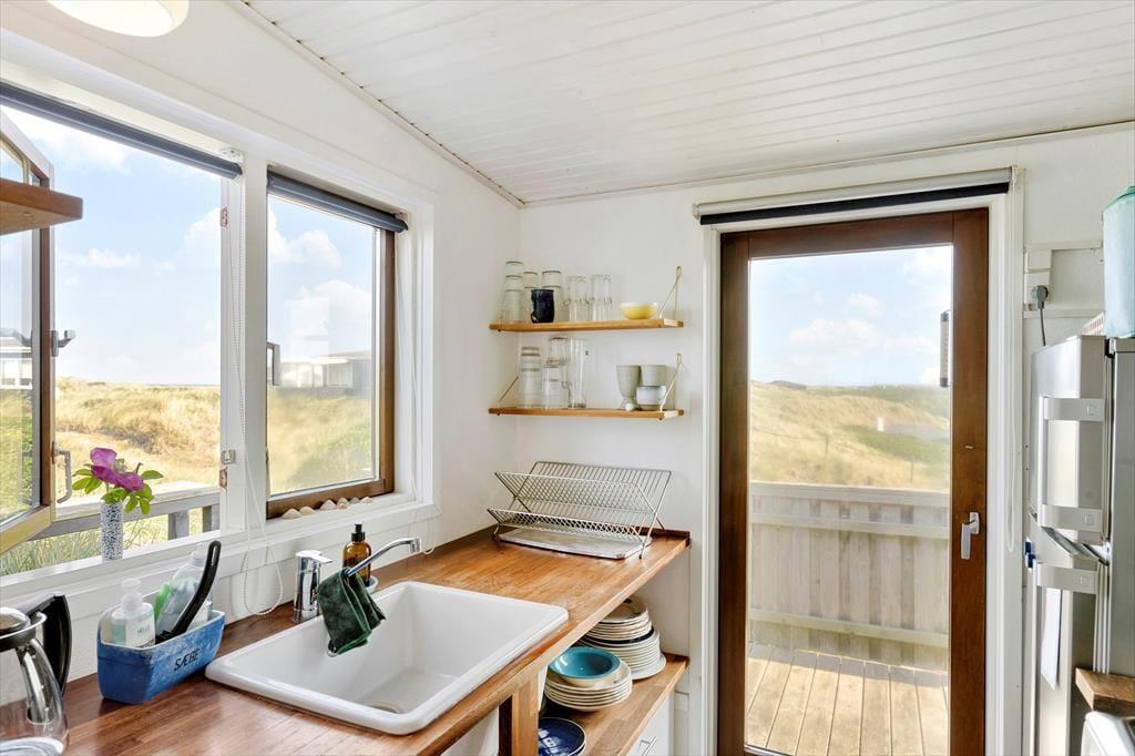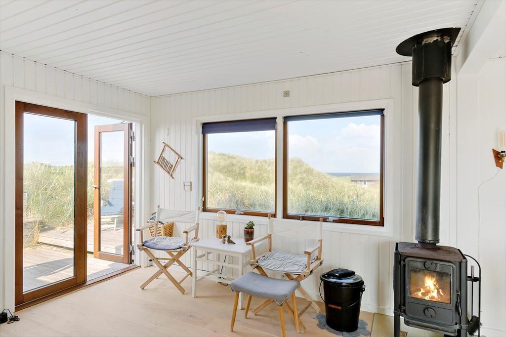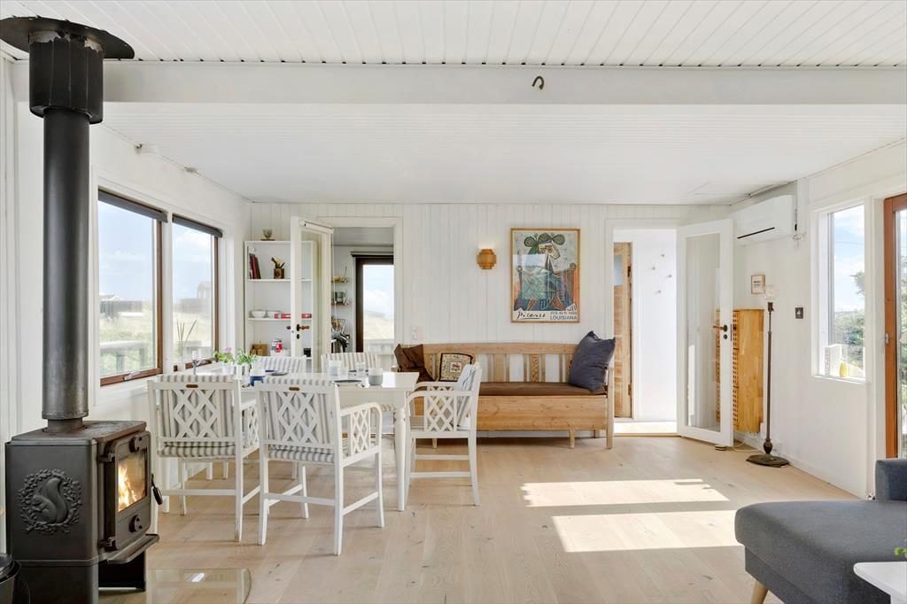 Det kønne træsommerhus har ligget her i klitterne siden 1936, og både inde og ude kan det tydeligt ses, at der er blevet taget godt hånd om det lige siden. De velholdte rum er moderniseret på smagfuld vis, og møbleringen passer perfekt til den klassiske arkitektur og de skønne naturomgivelser, som vinduespartierne åbenbarer til alle sider. Hyggestemningen er i top overalt, også på de tre soveværelser og i køkkenet – ja, selv badeværelset er gennemført indrettet med lyse farvetoner og hyggeskabende detaljer. Bedst af alle rum er nu næsten stuen, som er et skønt opholdsrum med brændeovn, store vinduer, et skønt lysindfald og endda havudsigt.