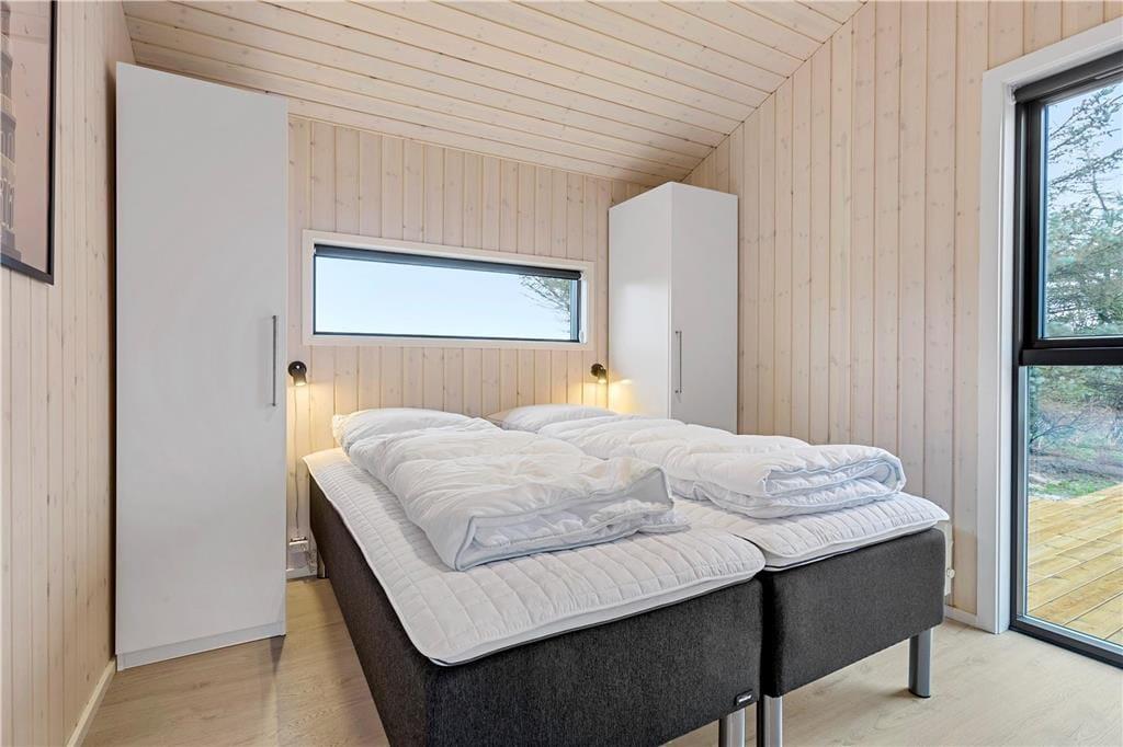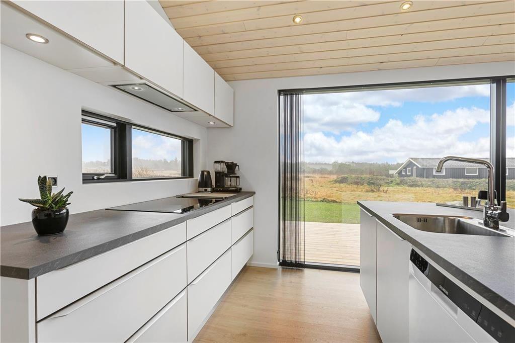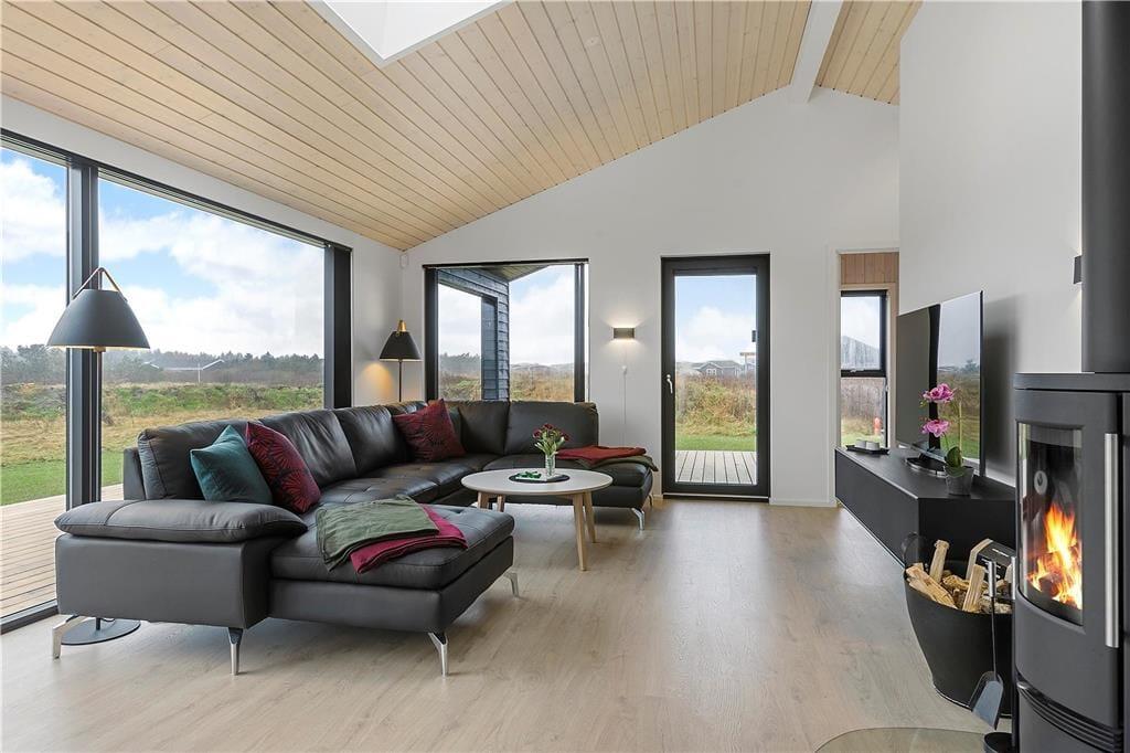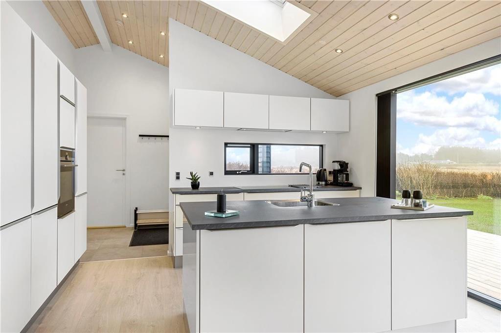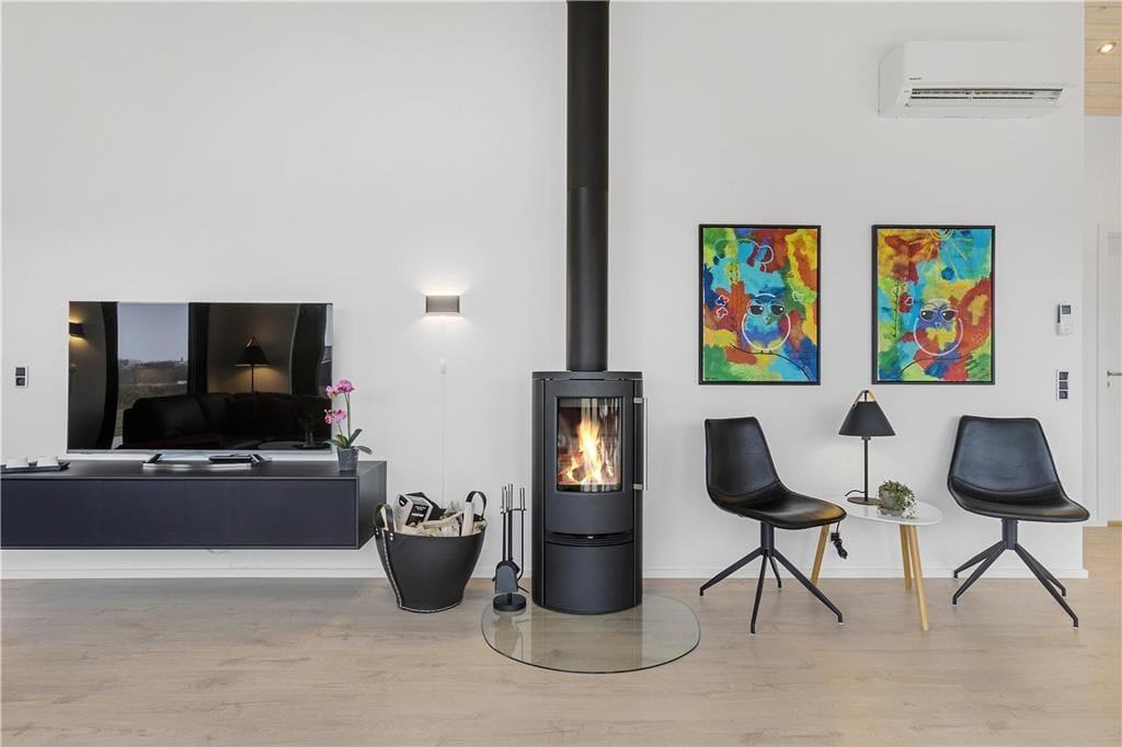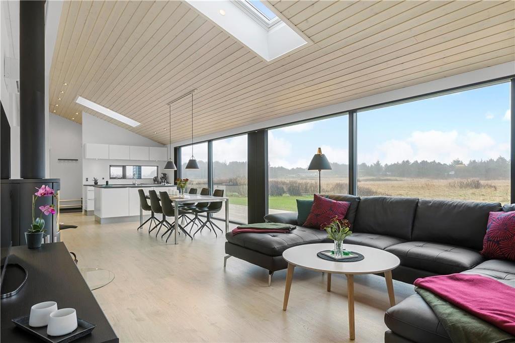 Det arkitektonisk stilrene sommerhus stod klart så sent som i 2019, så I kan se frem til at holde ferie i særdeles lækre og komfortable rammer, hvor alt bare spiller. Planløsningen er gennemtænkt, så de 115 m2 er udnyttet på bedste vis: De fire soveværelser ligger godt fordelt på den ene langside af huset, og derimellem finder I de to komplette badeværelser, hvoraf det ene er udstyret med spabad på luksuriøs vis. Et vaskerum ligger lige ved entréen – og endelig kommer vi til sommerhusets mest imponerende plet, som er et stort og højloftet opholdsrum med integreret køkkenafdeling, ovenlysvinduer, brændeovn og mange andre udsøgte detaljer. Bedst af alt er dog det kæmpestore vinduesparti, der inviterer dagslyset indenfor og åbenbarer udsigten over det fredede landskab. Dyrelivet er rigt i lokalområdet, så når I sidder samlet omkring spisebordet, kan det sagtens være, at I ser et par rådyr springe forbi.