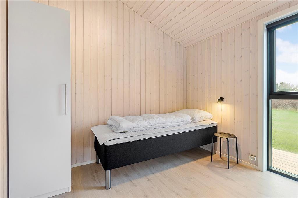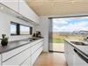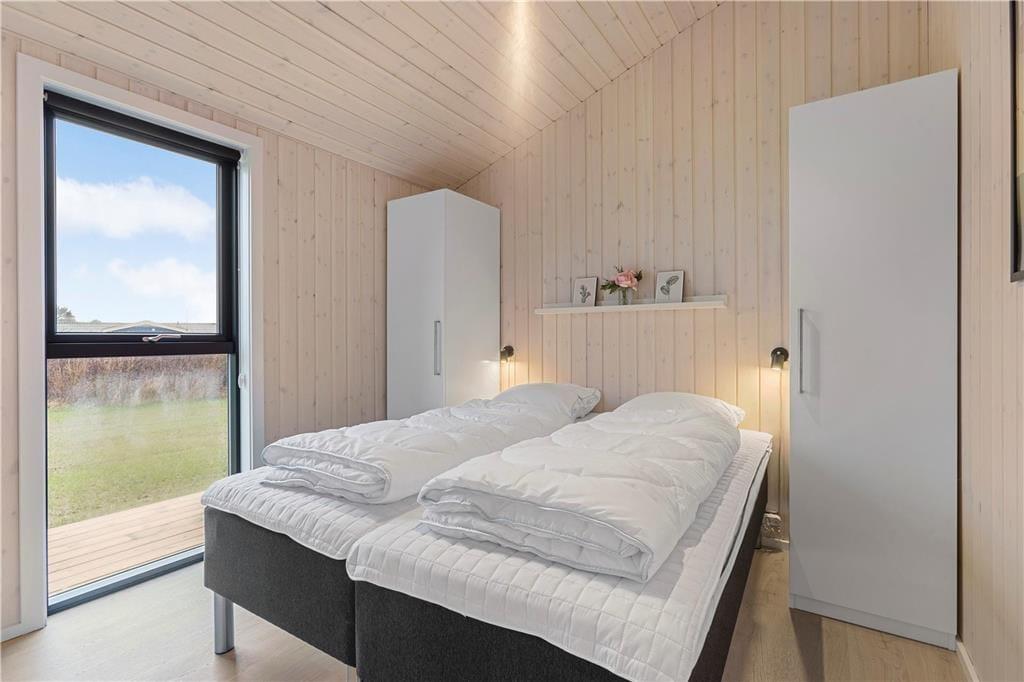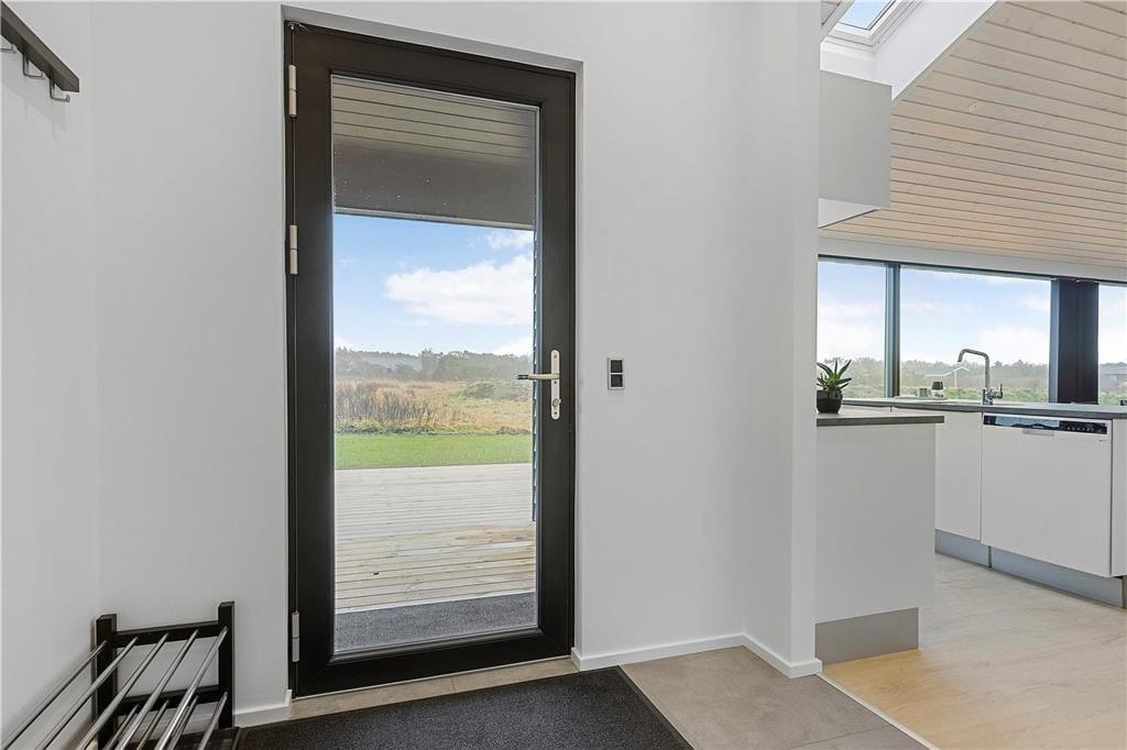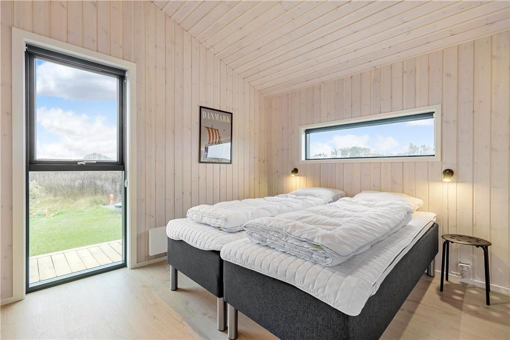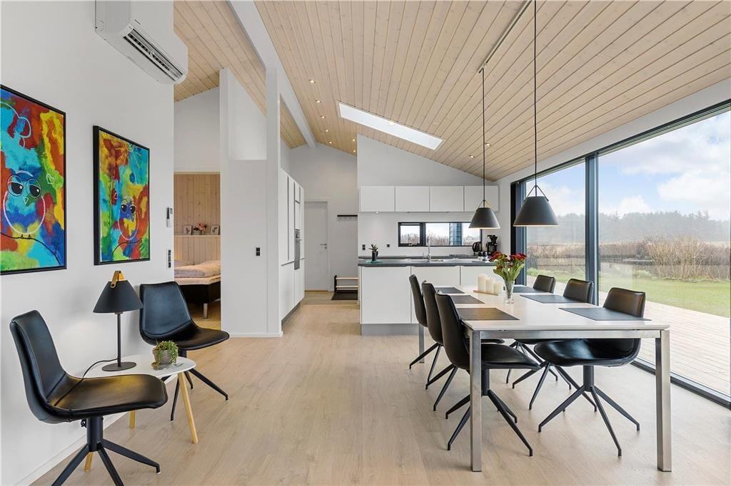 Det arkitektonisk stilrene sommerhus stod klart så sent som i 2019, så I kan se frem til at holde ferie i særdeles lækre og komfortable rammer, hvor alt bare spiller. Planløsningen er gennemtænkt, så de 115 m2 er udnyttet på bedste vis: De fire soveværelser ligger godt fordelt på den ene langside af huset, og derimellem finder I de to komplette badeværelser, hvoraf det ene er udstyret med spabad på luksuriøs vis. Et vaskerum ligger lige ved entréen – og endelig kommer vi til sommerhusets mest imponerende plet, som er et stort og højloftet opholdsrum med integreret køkkenafdeling, ovenlysvinduer, brændeovn og mange andre udsøgte detaljer. Bedst af alt er dog det kæmpestore vinduesparti, der inviterer dagslyset indenfor og åbenbarer udsigten over det fredede landskab. Dyrelivet er rigt i lokalområdet, så når I sidder samlet omkring spisebordet, kan det sagtens være, at I ser et par rådyr springe forbi.