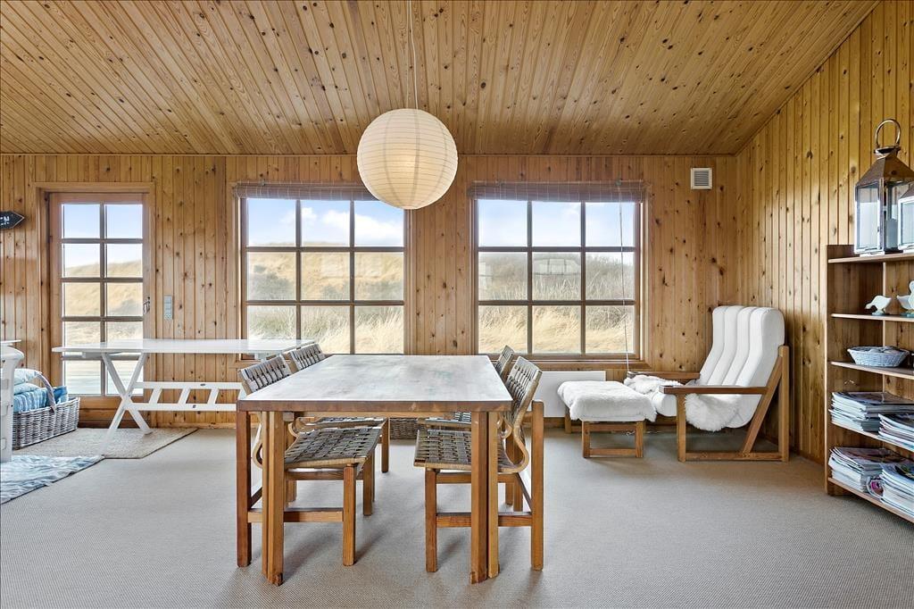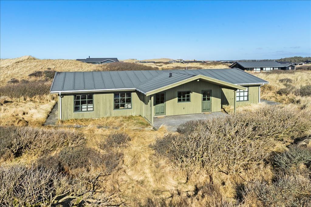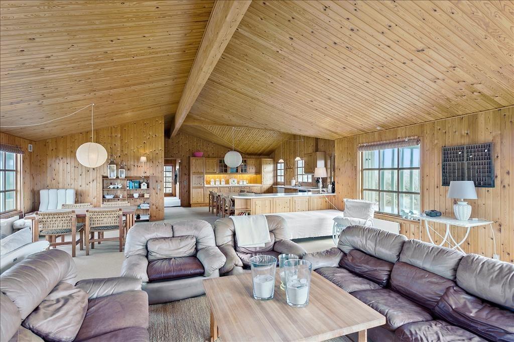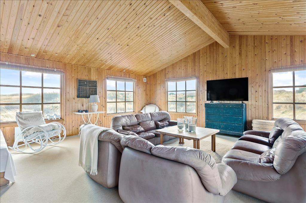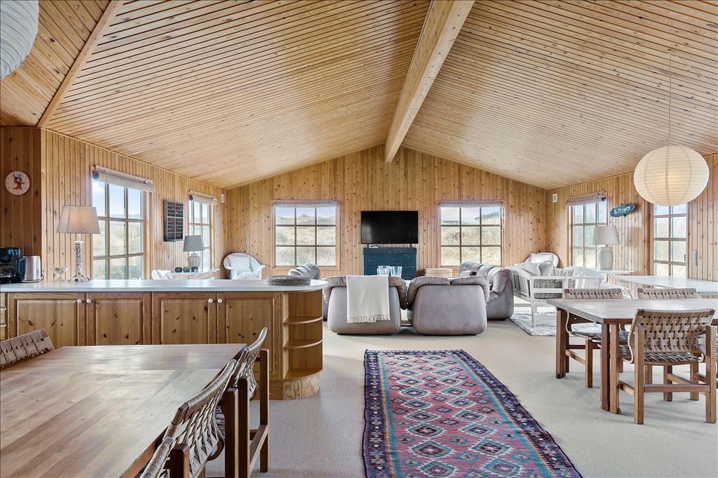 I får en smuk ramme om ferien, når den foregår i dette store og velholdte træsommerhus. Gennem vinduerne kan I nemlig kigge lige ud på bølgende marehalm og bløde klitter, og bare 100 meter væk venter Løkken Strand og Vesterhavet.