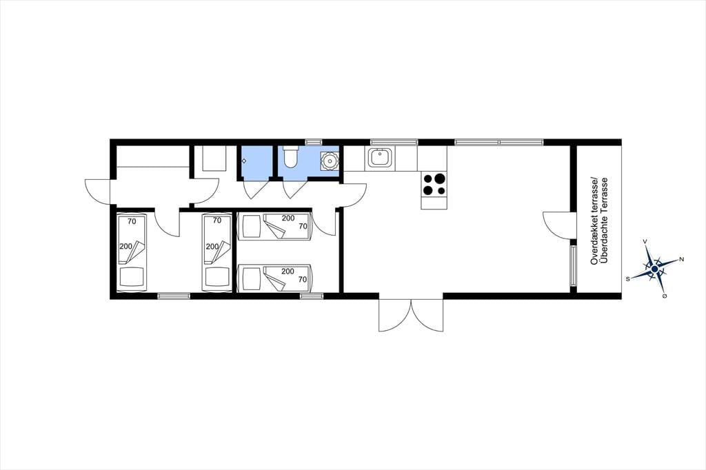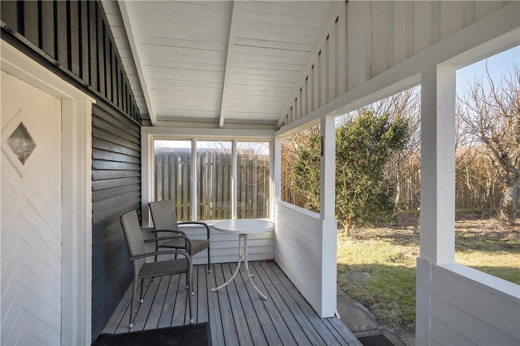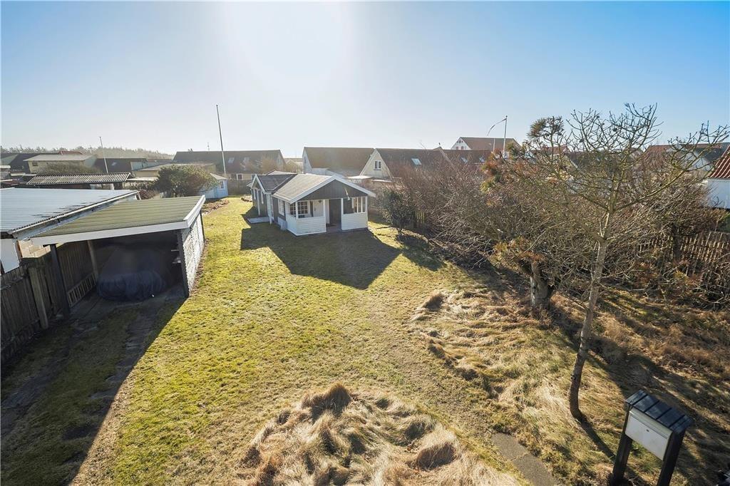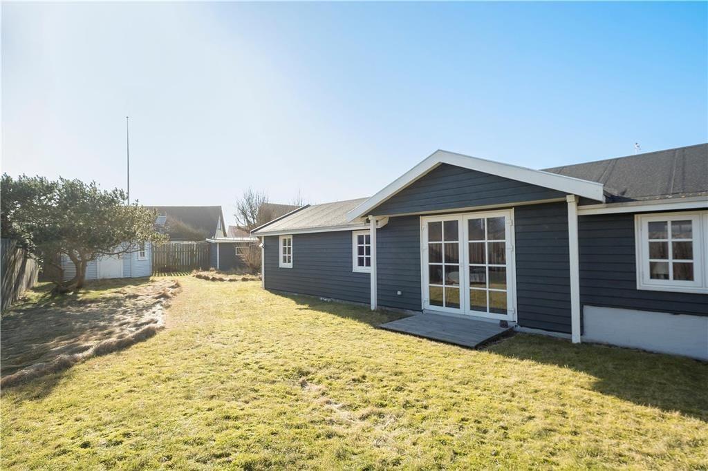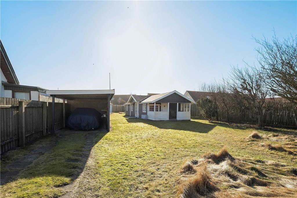 Sommerhuset ligger lidt tilbagetrukket fra vejen på en 655 m2 stor grund, der skærmes af plankeværk til alle sider. Det betyder, at haven er helt lukket og ret ugeneret, så det er et dejligt sted at sidde i en solstråle, grille og lege på græsplænen. En hyggelig opholdsplads er den overdækkede terrasse, hvor I kan blive siddende til langt ud på aftenen, mens mørket sænker sig over Løkken.
