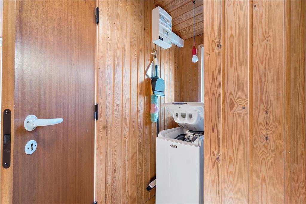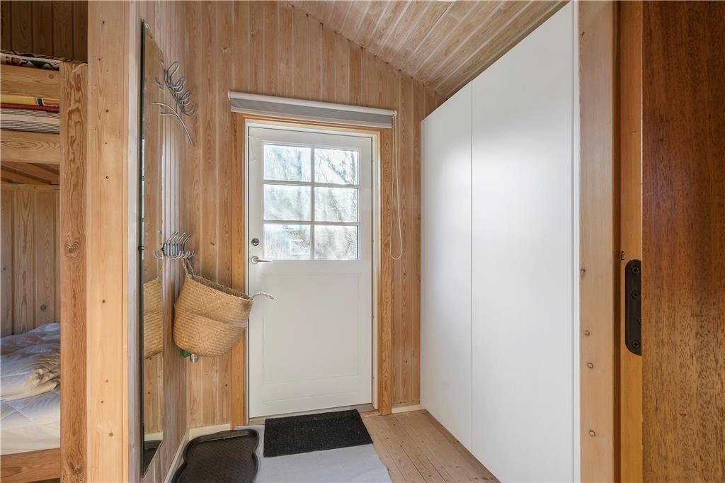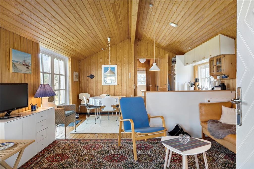 Inden døre har I 54 m2 at gøre godt med, så sommerhuset er altså ikke et af de største på markedet. Men hvem har også brug for mange kvadratmeter, når rammerne er så charmerende, og I under alle omstændigheder gerne vil bruge en stor del af tiden sammen? I den ene ende af sommerhuset ligger to soveværelser, et vaskerum, et toilet og en separat brusekabine, mens en dejlig stue med integreret køkken udgør den anden halvdel. Med trælister på væggene, loft til kip og sprossevinduer emmer huset af vaskeægte sommerhusatmosfære, og møblementet er med til at understrege den hyggelige fornemmelse.