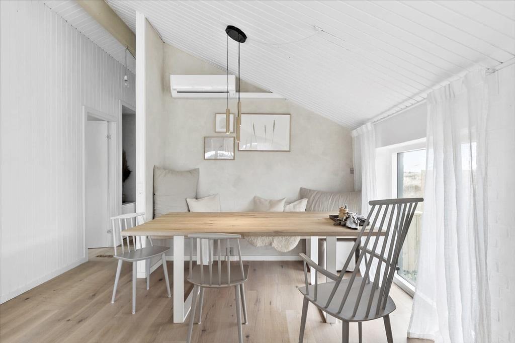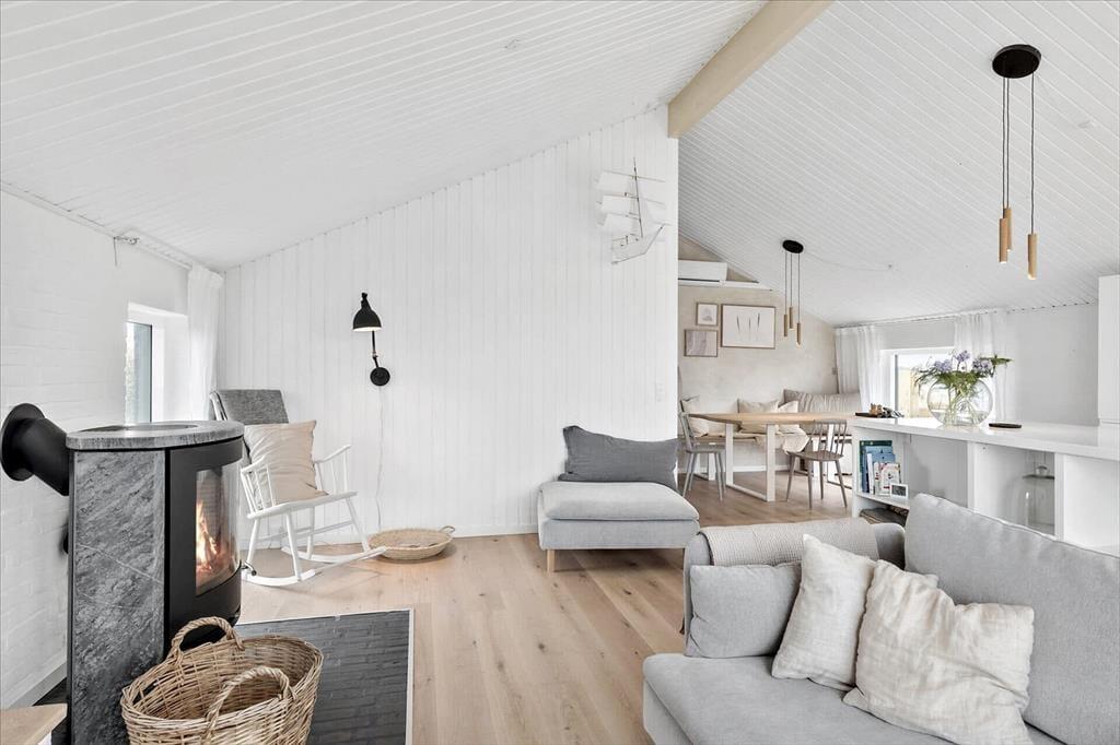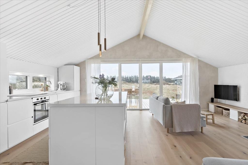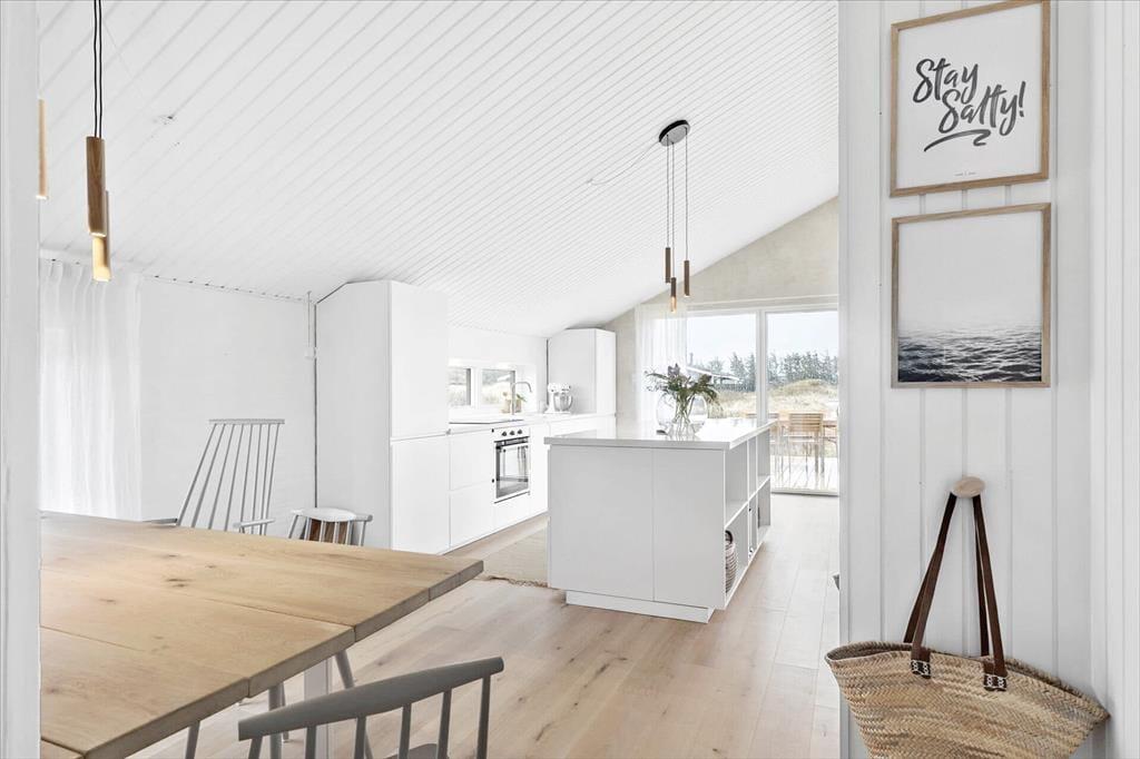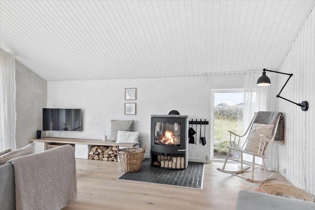 Sommerhuset har en lys, skandinavisk indretning, der passer perfekt til kystlandskabets marehalm og åbne vidder. Og på grund af den rare atmosfære og de hyggelige detaljer er det let øjeblikkeligt at føle sig hjemme inden døre. For eksempel er det skønt at samles omkring spisebordet i opholdsrummet eller at slappe af i sofaafdelingen, hvor et fladskærms-TV med Chromecast står klar til at levere underholdningen. Er det køligt udenfor, kan I tænde op i brændeovnen, og hvis I bliver sultne, kan I gå i gang med at kokkerere i det flotte åbne køkken. Resten af ferieboligen præsenterer sig også på indbydende vis, både badeværelset og de tre soveværelser, der i alt har sengepladser til fem personer.