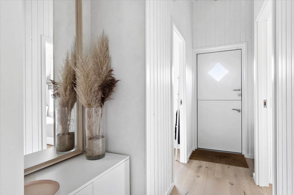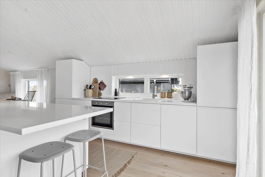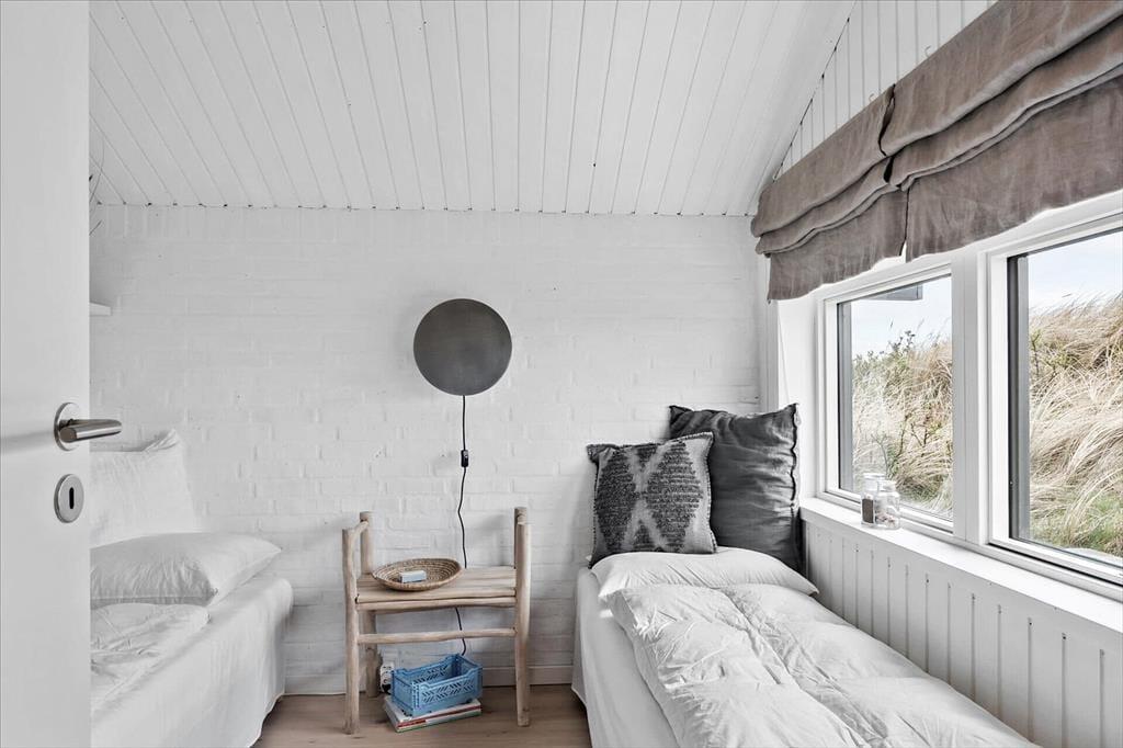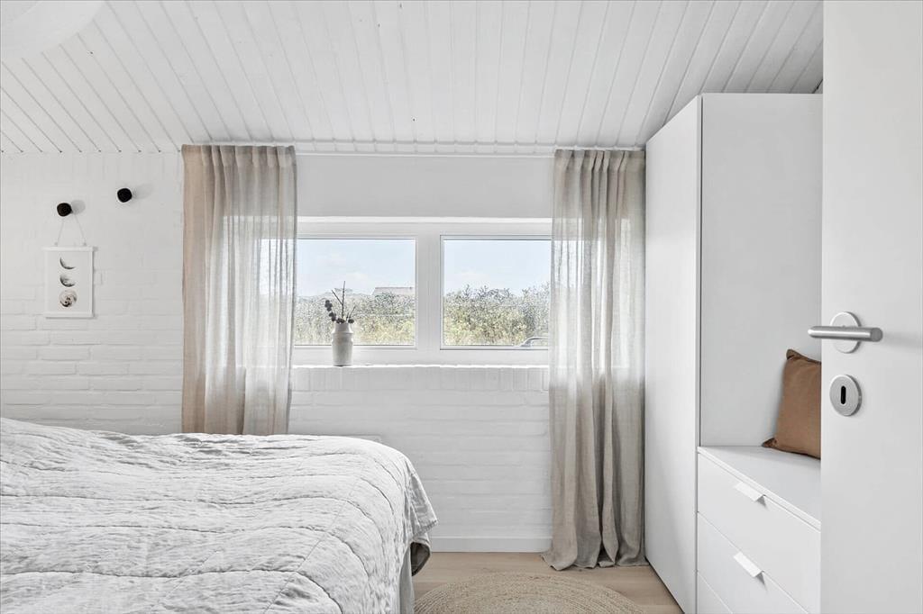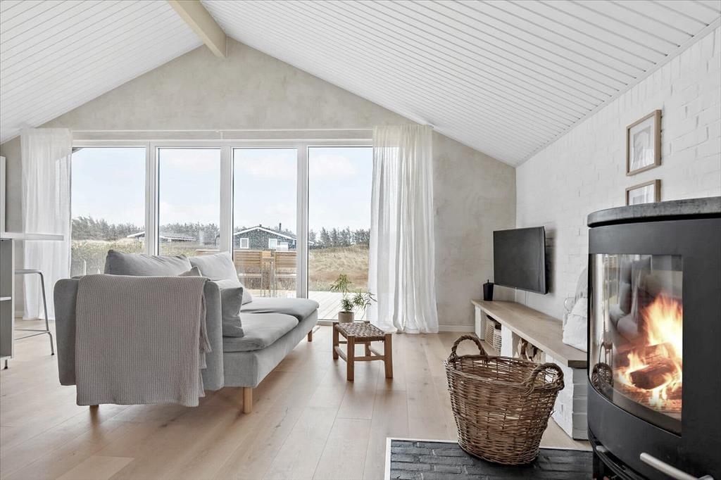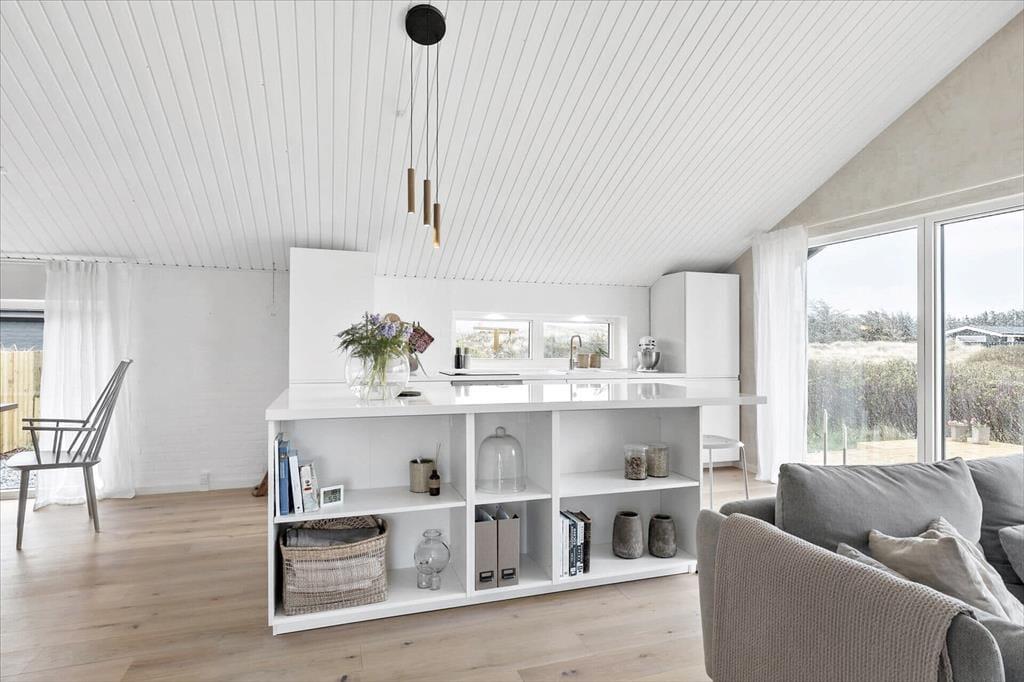 Sommerhuset har en lys, skandinavisk indretning, der passer perfekt til kystlandskabets marehalm og åbne vidder. Og på grund af den rare atmosfære og de hyggelige detaljer er det let øjeblikkeligt at føle sig hjemme inden døre. For eksempel er det skønt at samles omkring spisebordet i opholdsrummet eller at slappe af i sofaafdelingen, hvor et fladskærms-TV med Chromecast står klar til at levere underholdningen. Er det køligt udenfor, kan I tænde op i brændeovnen, og hvis I bliver sultne, kan I gå i gang med at kokkerere i det flotte åbne køkken. Resten af ferieboligen præsenterer sig også på indbydende vis, både badeværelset og de tre soveværelser, der i alt har sengepladser til fem personer.