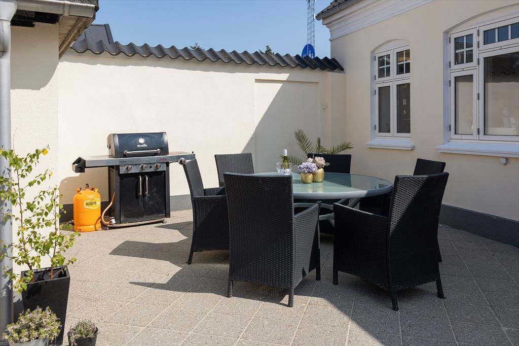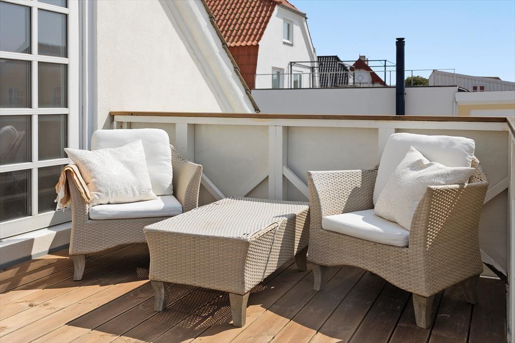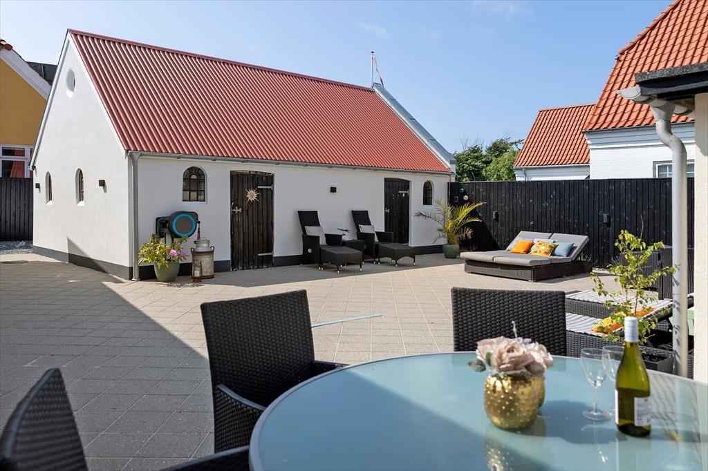 En skøn gårdhave bag huset giver jer en dejlig ramme om ferieturens hyggelige udendørs stunder. Her får I jeres helt private oase midt i byen, hvor I kan tilbringe lange dasedage eller bare tage en pause fra badeture og restaurantbesøg i byen. Vil I også have udsigten med, kan I trække op på førstesalen, hvor I finder en fin terrasse med aftensol og kig over hustagene.
